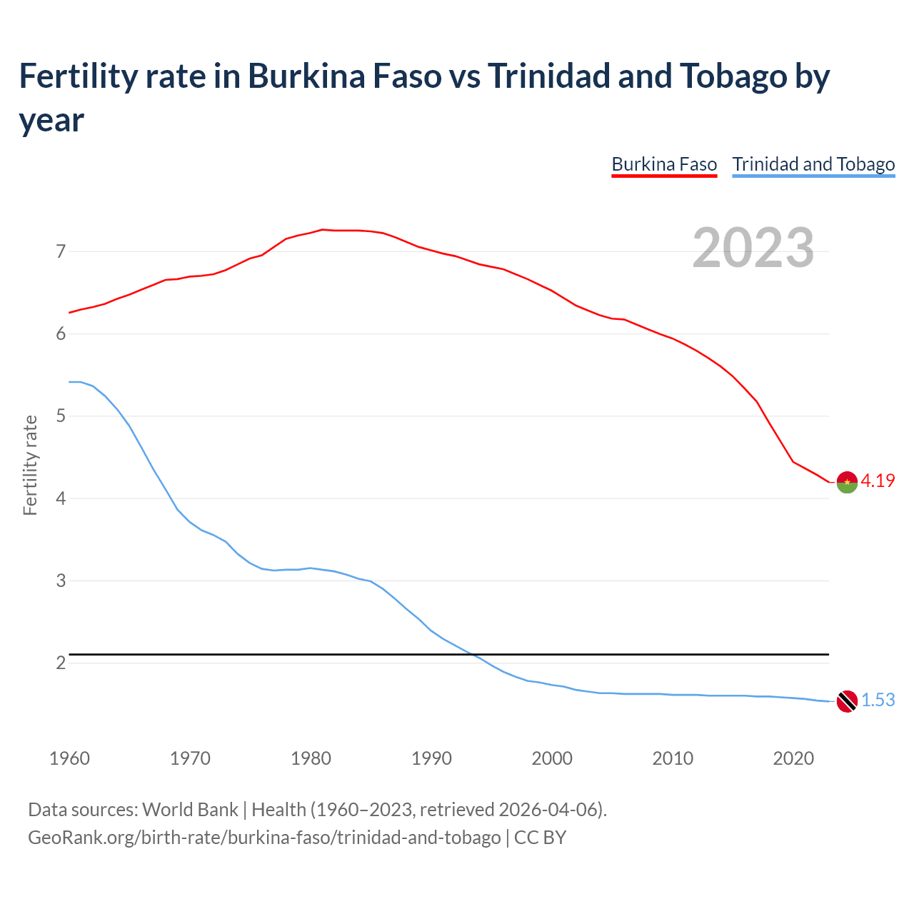 1960 vs 2023, the fertility rate has decreased by 33% in Burkina Faso and by 71.7% in Trinidad and Tobago — in 1960, it was 6.25 and 5.41, respectively.