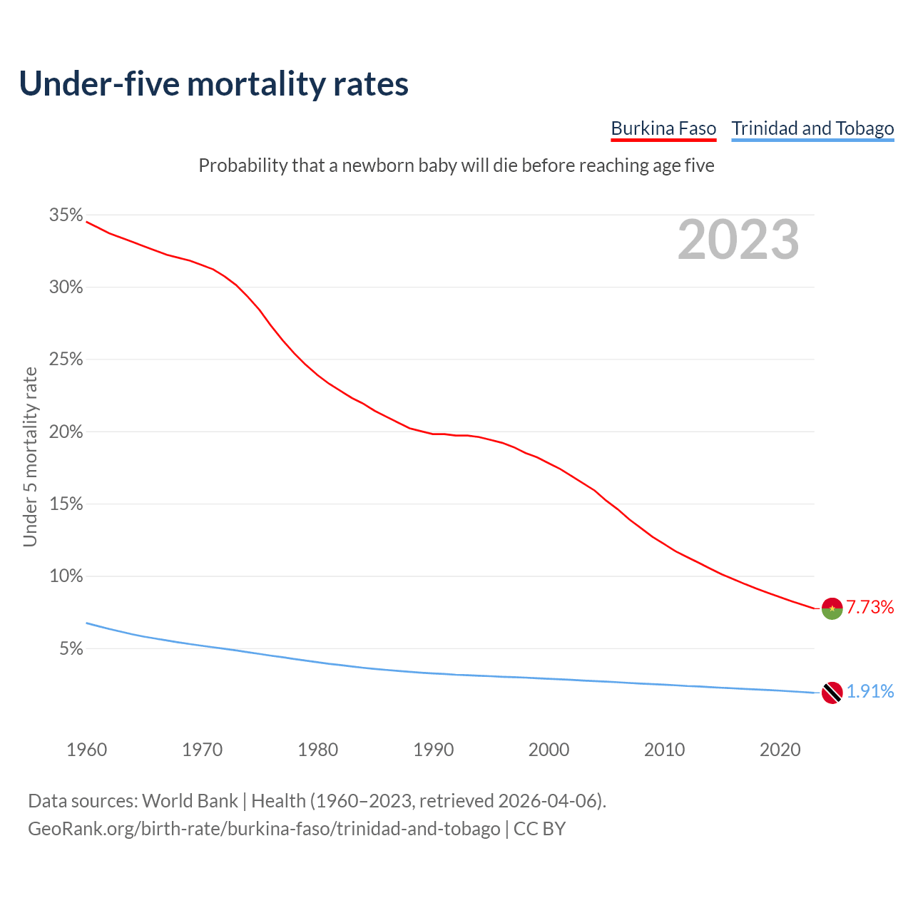 The chance that a newborn baby will die before reaching age five is 7.73% in Burkina Faso and 1.91% in Trinidad and Tobago. Above is a chart with historical data on under-five mortality rates.