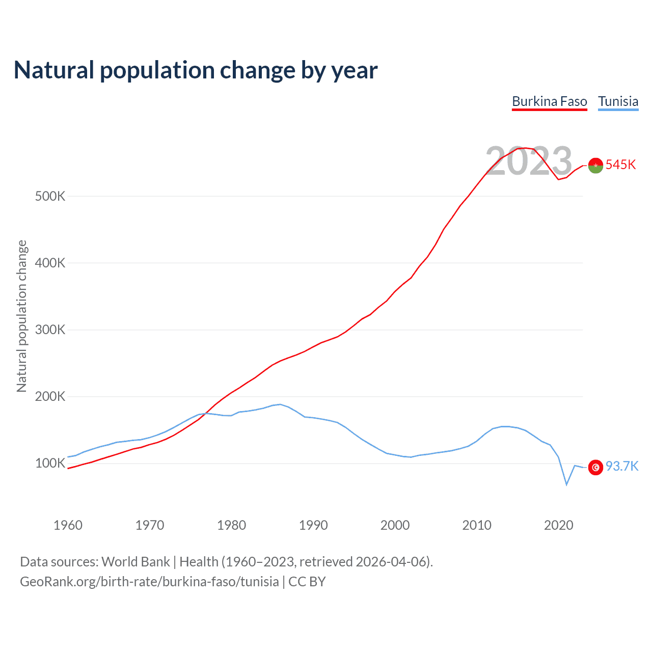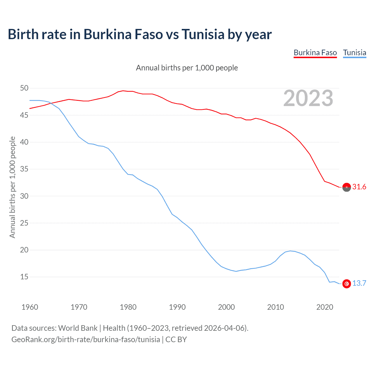 Burkina Faso has an annual birth rate of 31.6 births per 1,000 people, compared to 13.7 for Tunisia. The average number of children a woman is expected to have during her lifetime — the fertility rate, is 4.19 in Burkina Faso and 1.83 in Tunisia — 56.2% difference.