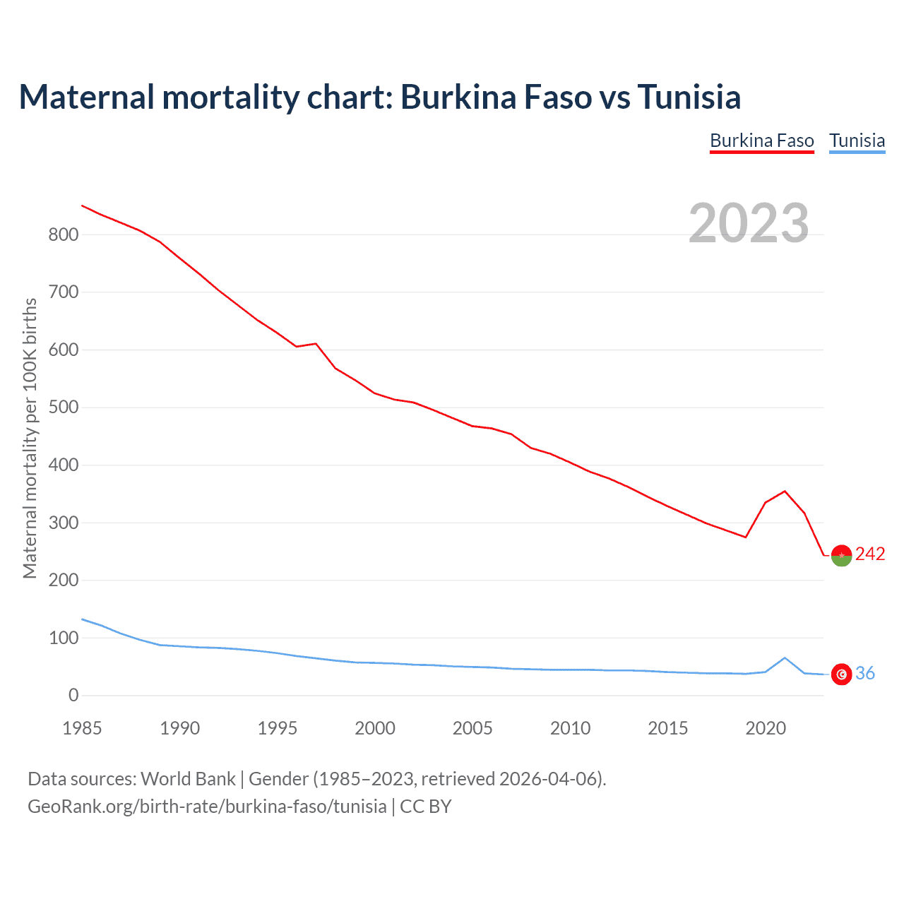 The maternal mortality rate, which is the probability of dying during childbirth or within 42 days of pregnancy termination, is 242 deaths per 100,000 live births in Burkina Faso, compared to 36 deaths in Tunisia.