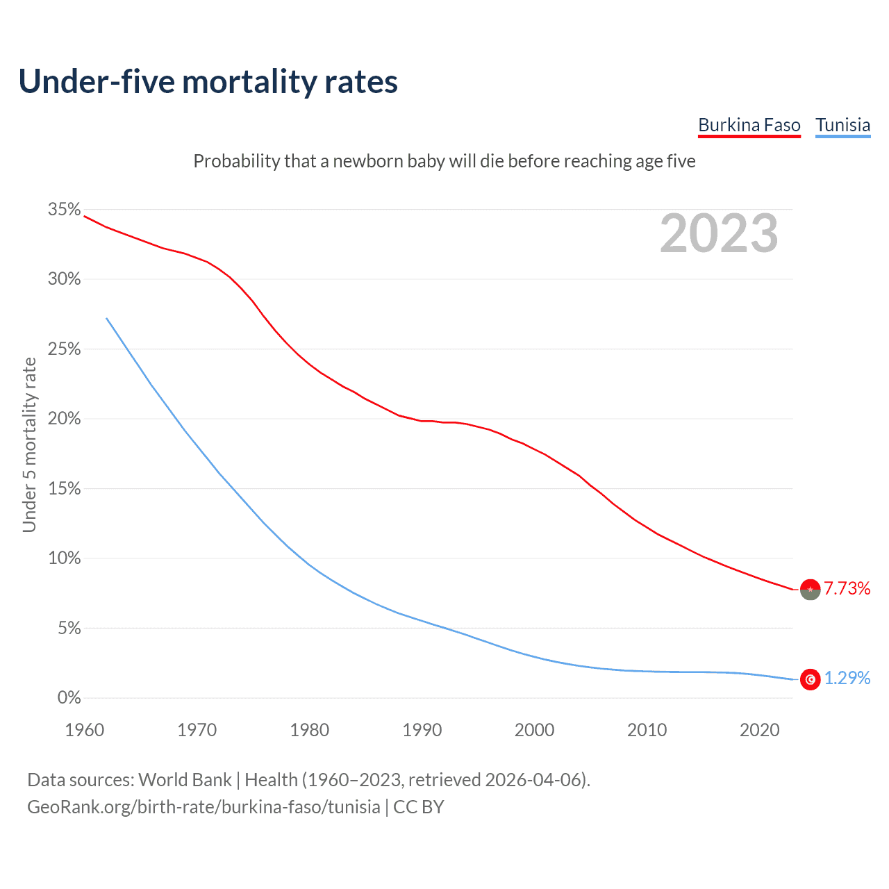 The chance that a newborn baby will die before reaching age five is 7.73% in Burkina Faso and 1.29% in Tunisia. Above is a chart with historical data on under-five mortality rates.