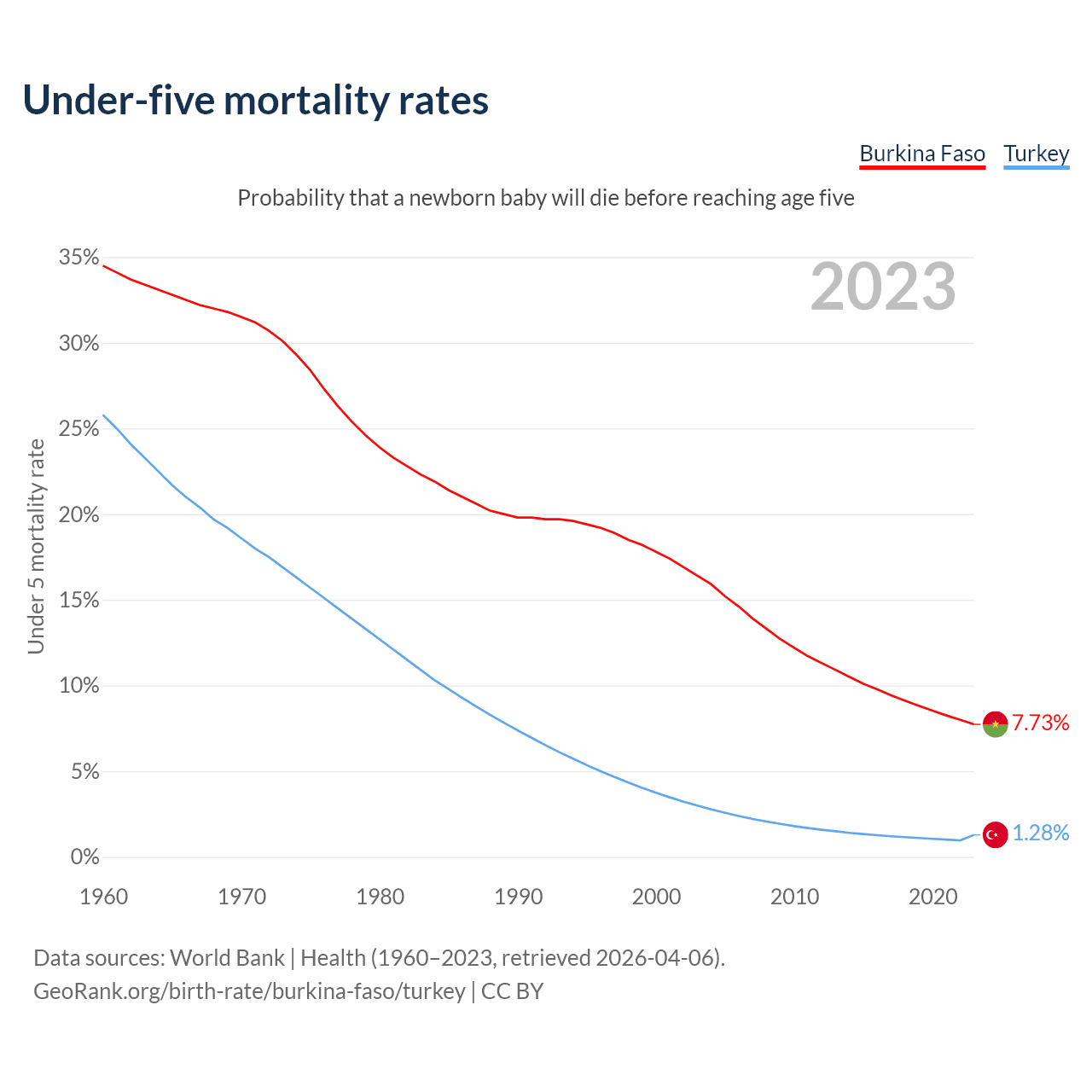 The chance that a newborn baby will die before reaching age five is 7.73% in Burkina Faso and 1.28% in Turkey. Above is a chart with historical data on under-five mortality rates.