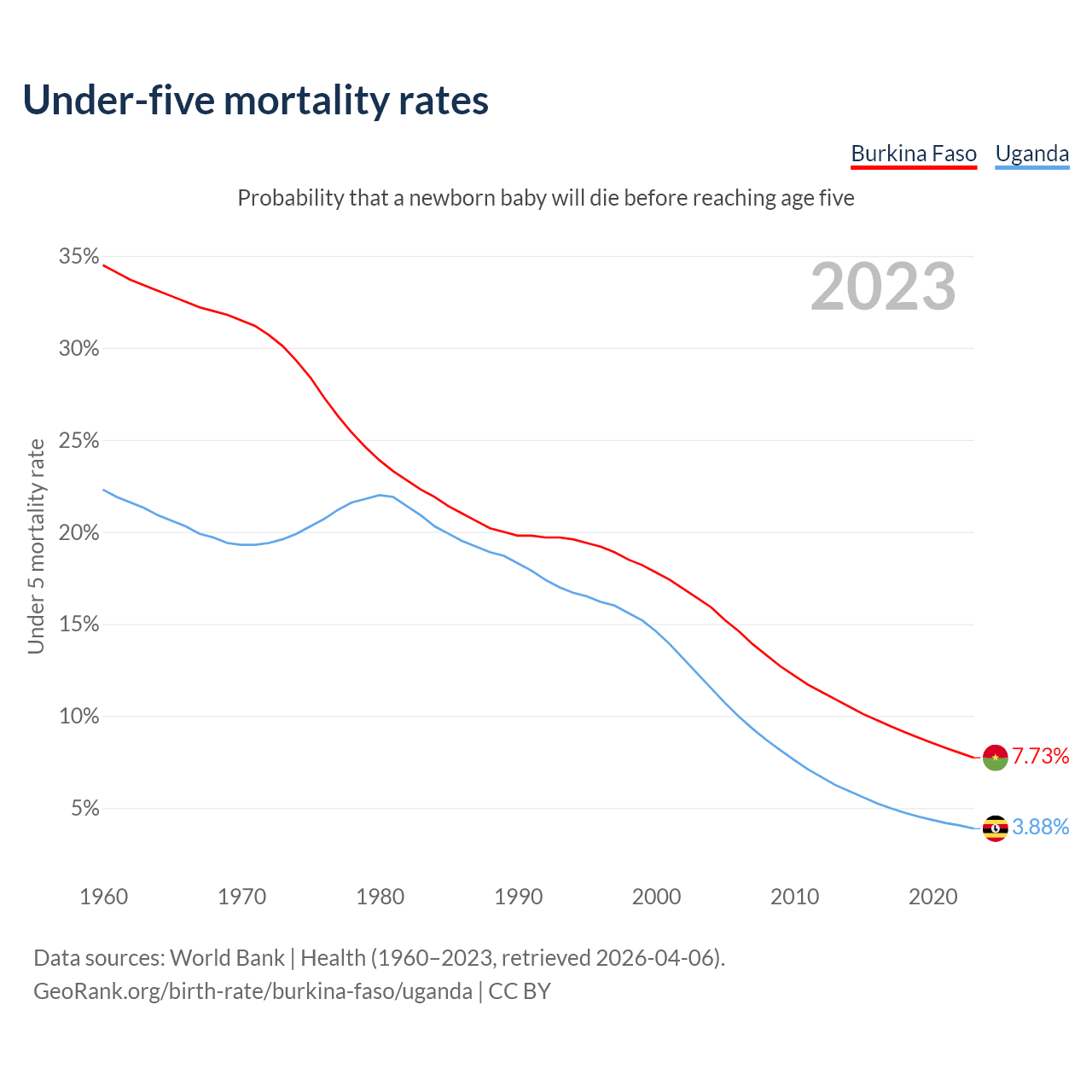 The chance that a newborn baby will die before reaching age five is 7.73% in Burkina Faso and 3.88% in Uganda. Above is a chart with historical data on under-five mortality rates.