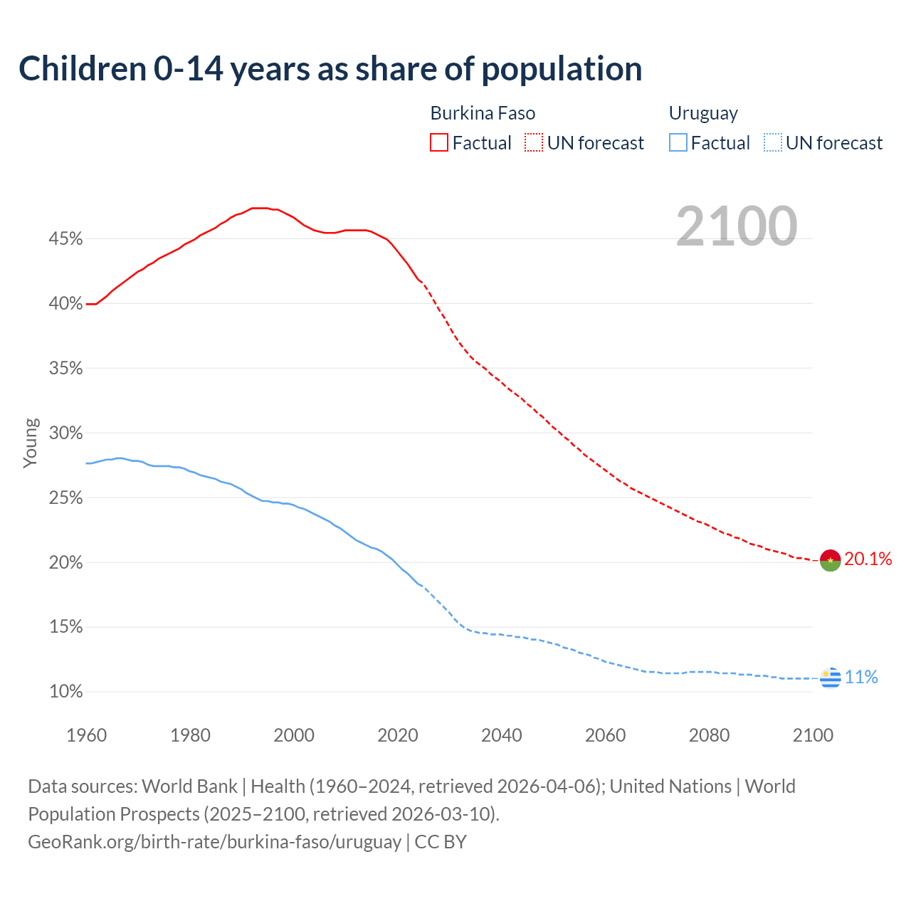 Burkina Faso has an annual birth rate of 31.6 births per 1,000 people, compared to 9.87 for Uruguay. The average number of children a woman is expected to have during her lifetime — the fertility rate, is 4.19 in Burkina Faso and 1.41 in Uruguay — 66.3% difference.