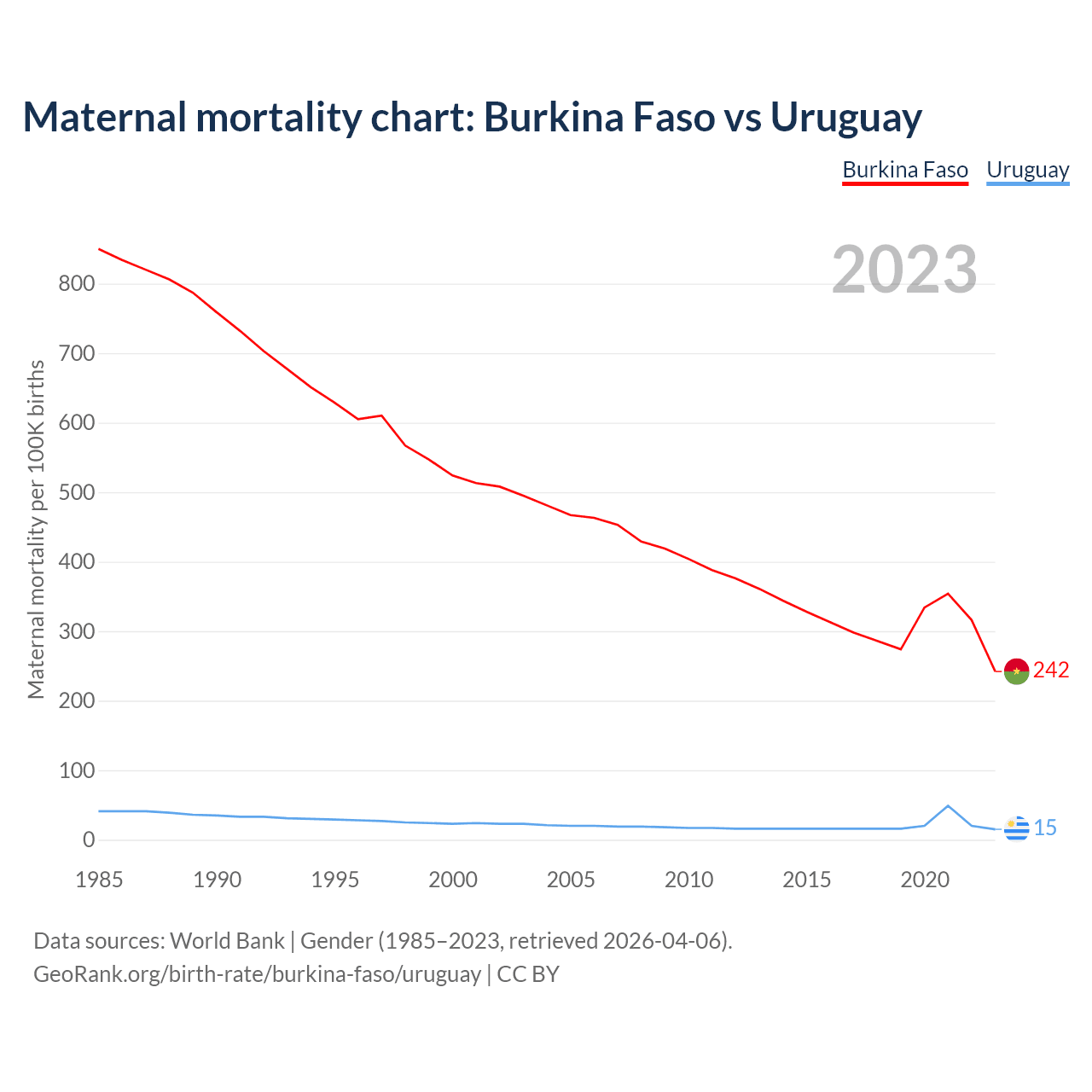 The maternal mortality rate, which is the probability of dying during childbirth or within 42 days of pregnancy termination, is 242 deaths per 100,000 live births in Burkina Faso, compared to 15 deaths in Uruguay.