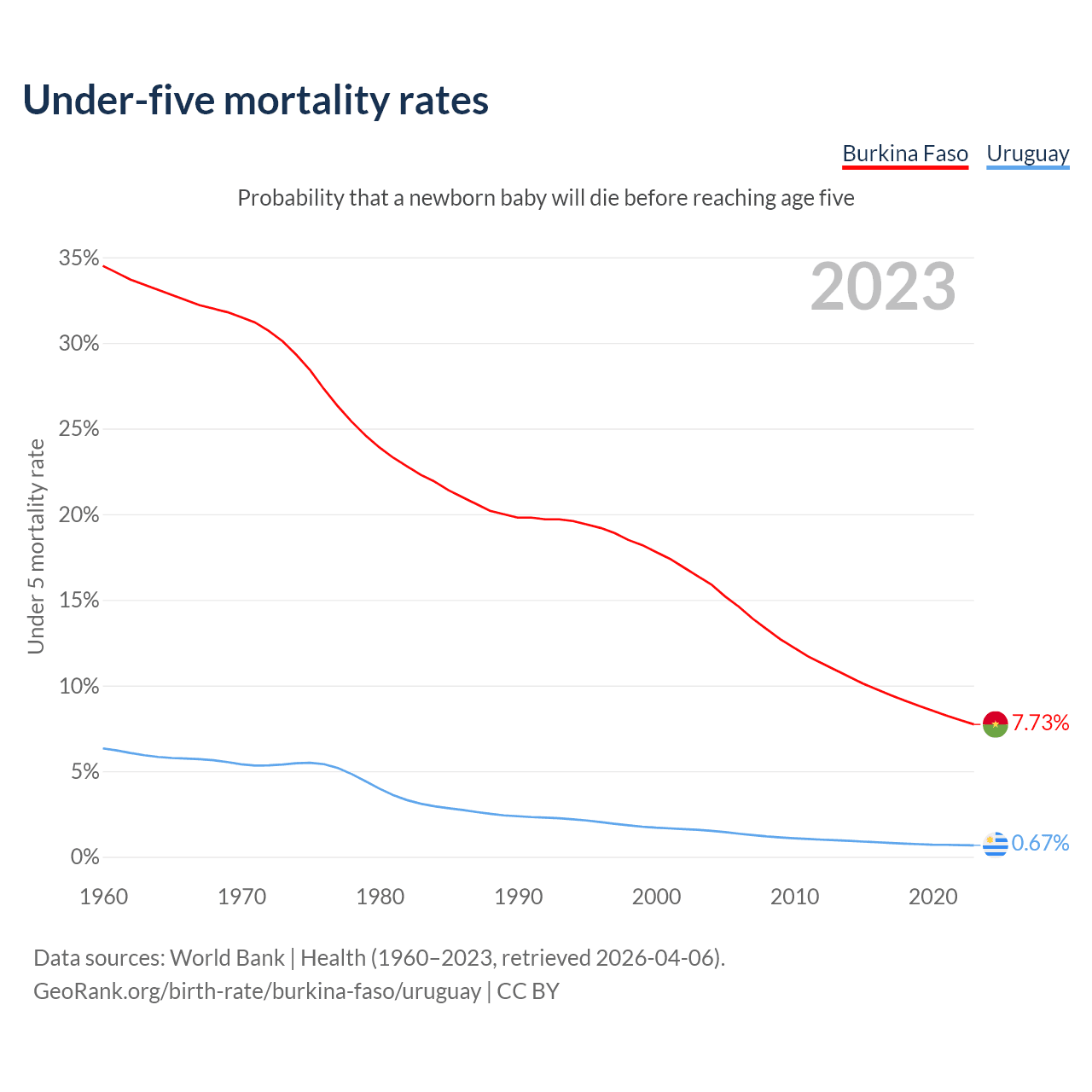 The chance that a newborn baby will die before reaching age five is 7.73% in Burkina Faso and 0.67% in Uruguay. Above is a chart with historical data on under-five mortality rates.