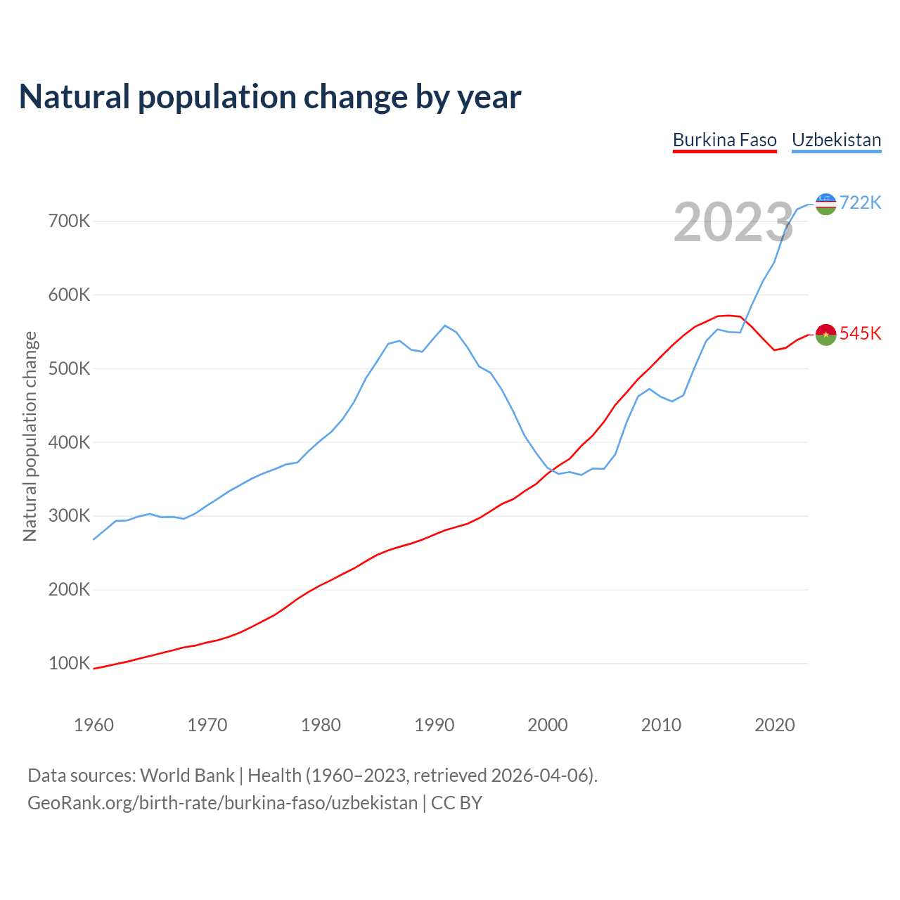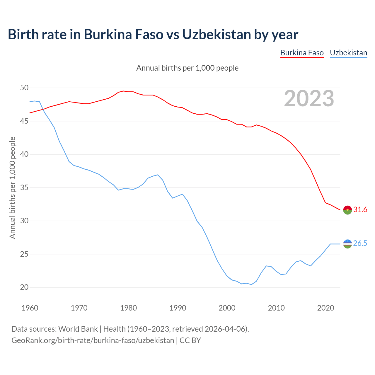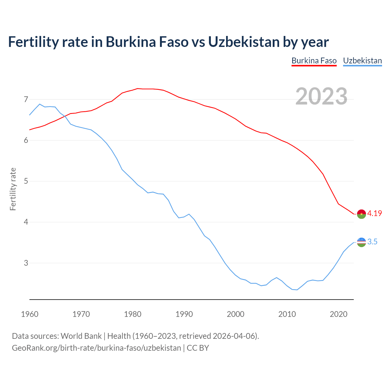 Burkina Faso has an annual birth rate of 31.6 births per 1,000 people, compared to 26.5 for Uzbekistan. The average number of children a woman is expected to have during her lifetime — the fertility rate, is 4.19 in Burkina Faso and 3.5 in Uzbekistan — 16.4% difference.