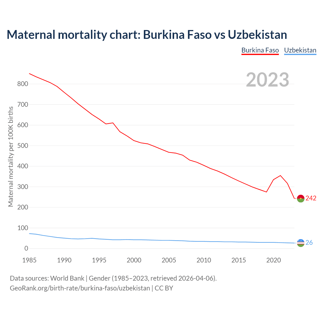 The maternal mortality rate, which is the probability of dying during childbirth or within 42 days of pregnancy termination, is 242 deaths per 100,000 live births in Burkina Faso, compared to 26 deaths in Uzbekistan.