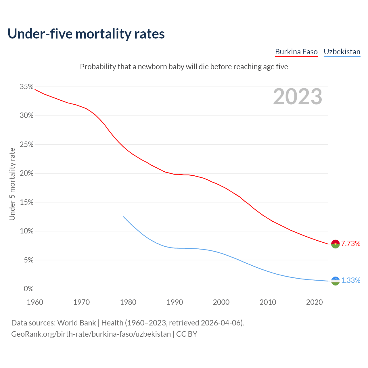 The chance that a newborn baby will die before reaching age five is 7.73% in Burkina Faso and 1.33% in Uzbekistan. Above is a chart with historical data on under-five mortality rates.