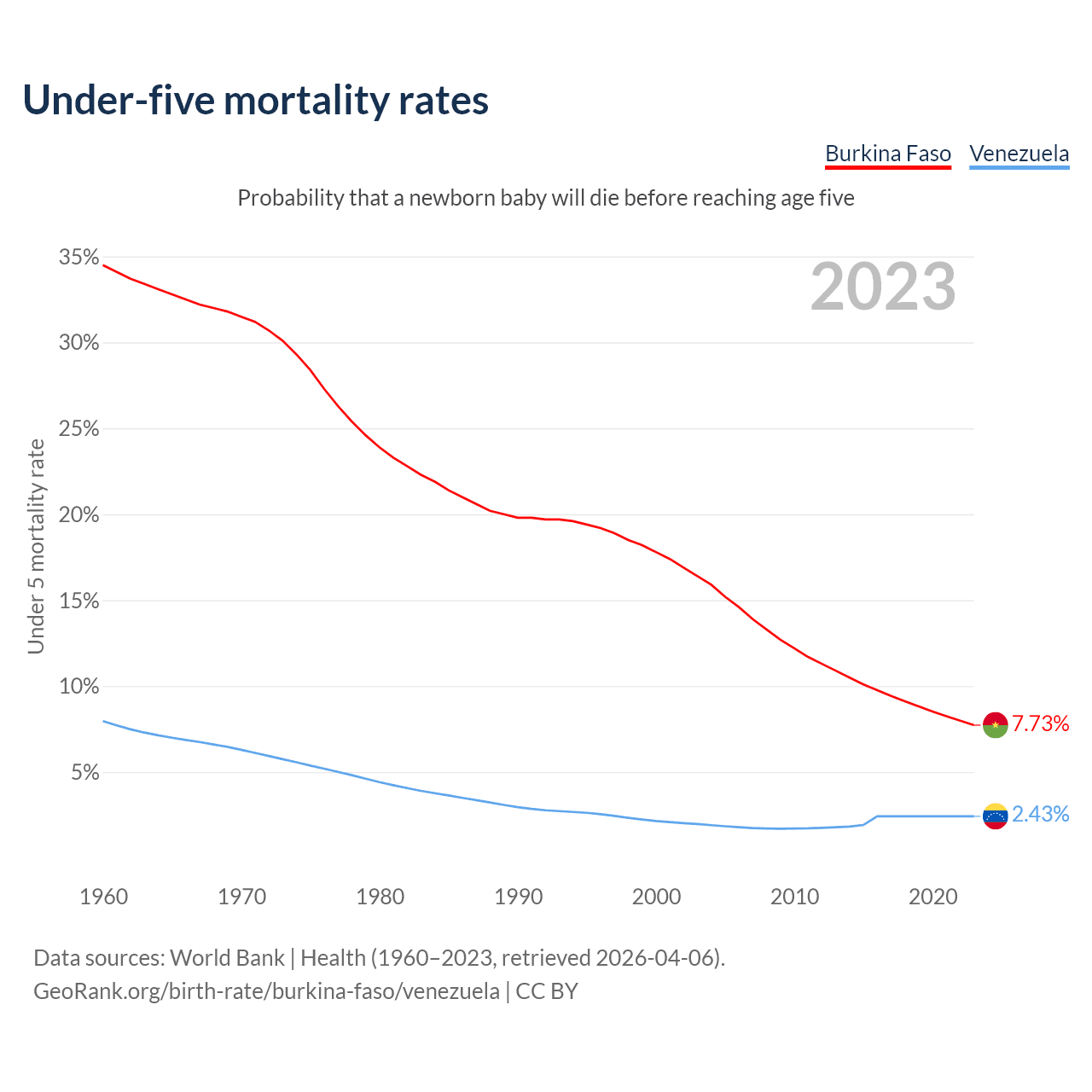 The chance that a newborn baby will die before reaching age five is 7.73% in Burkina Faso and 2.43% in Venezuela. Above is a chart with historical data on under-five mortality rates.