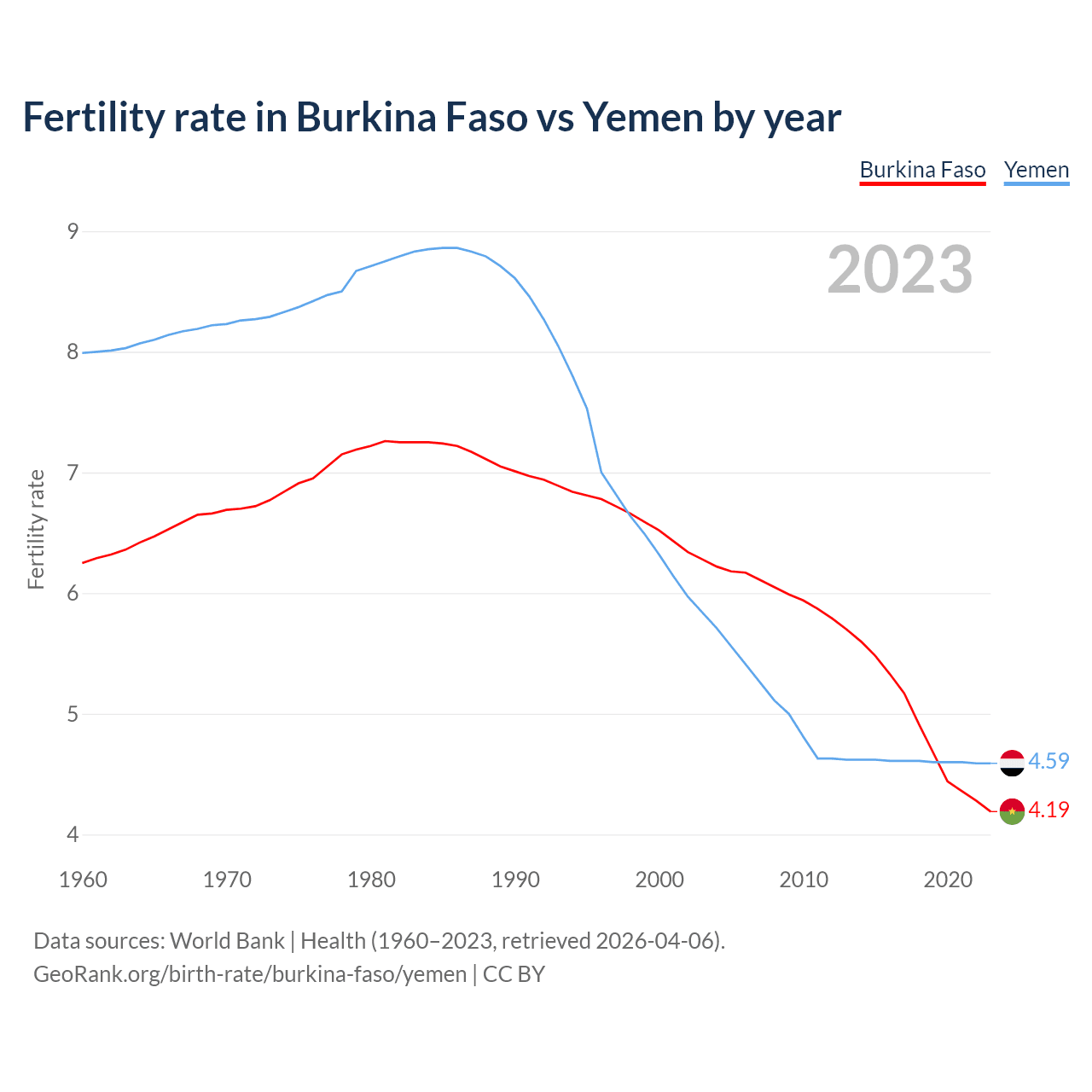 Fertility rate in Burkina Faso vs Yemen by year