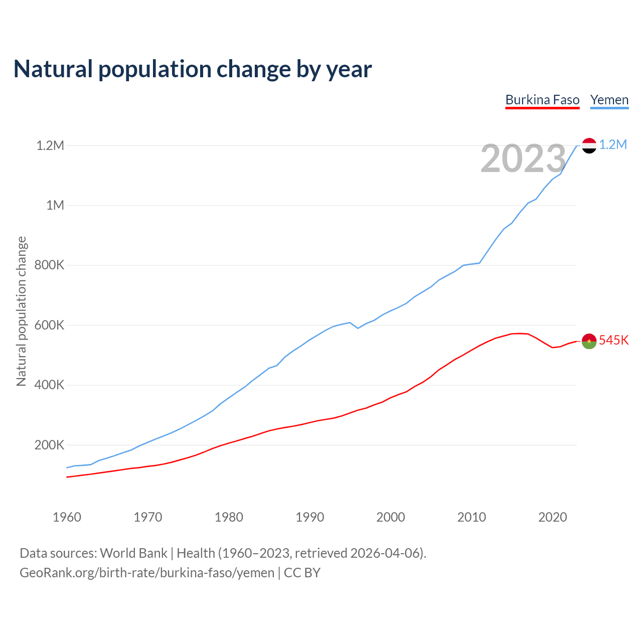 Check Burkina Faso vs Yemen population clock for a dynamic visualization of the changing population.