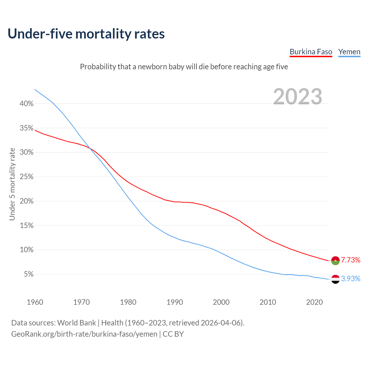The chance that a newborn baby will die before reaching age five is 7.73% in Burkina Faso and 3.93% in Yemen. Above is a chart with historical data on under-five mortality rates.