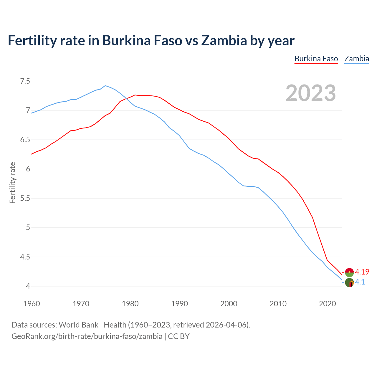 1960 vs 2023, the fertility rate has decreased by 33% in Burkina Faso and by 41% in Zambia — in 1960, it was 6.25 and 6.95, respectively.