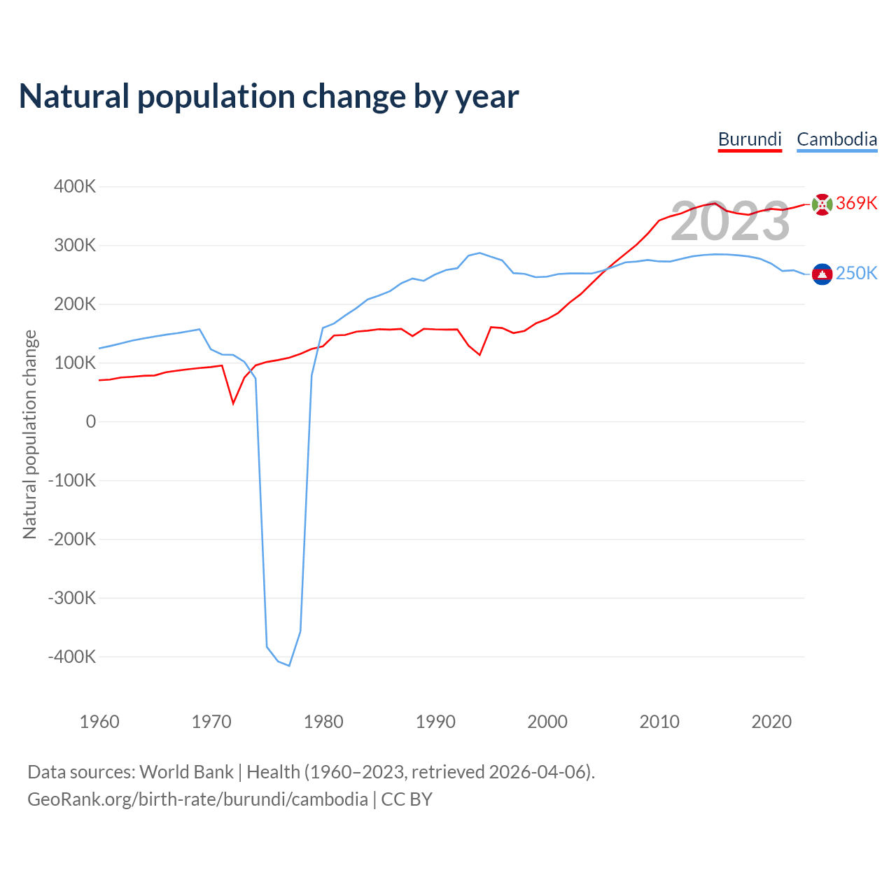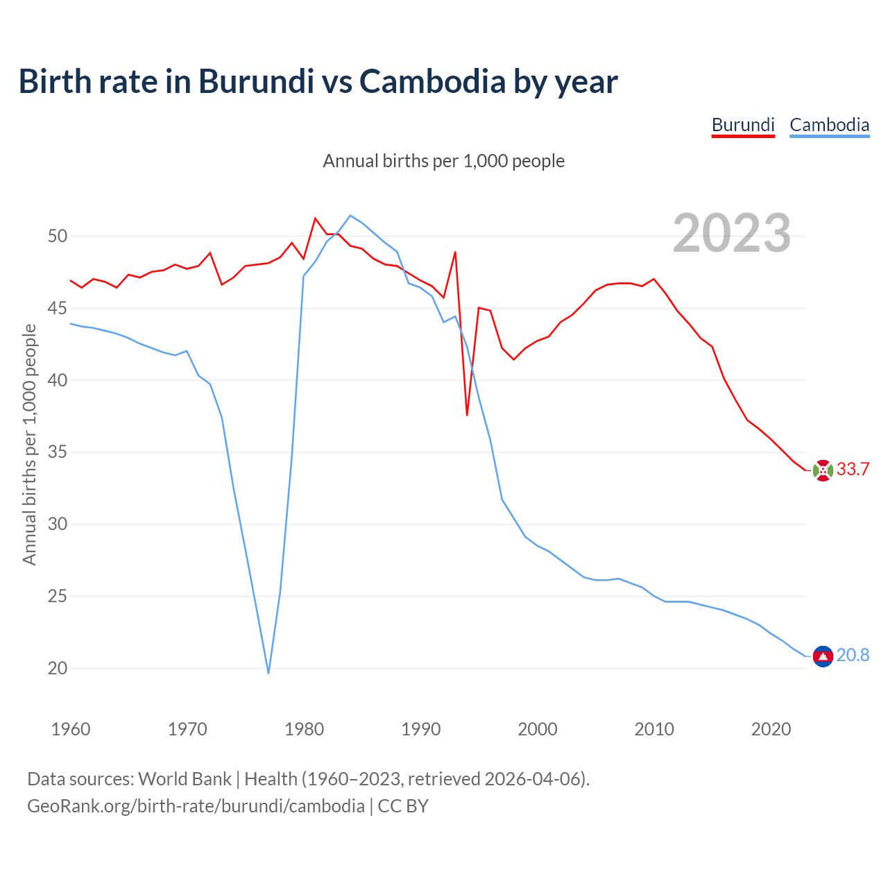 Burundi has an annual birth rate of 33.7 births per 1,000 people, compared to 20.8 for Cambodia. The average number of children a woman is expected to have during her lifetime — the fertility rate, is 4.88 in Burundi and 2.58 in Cambodia — 47.1% difference.