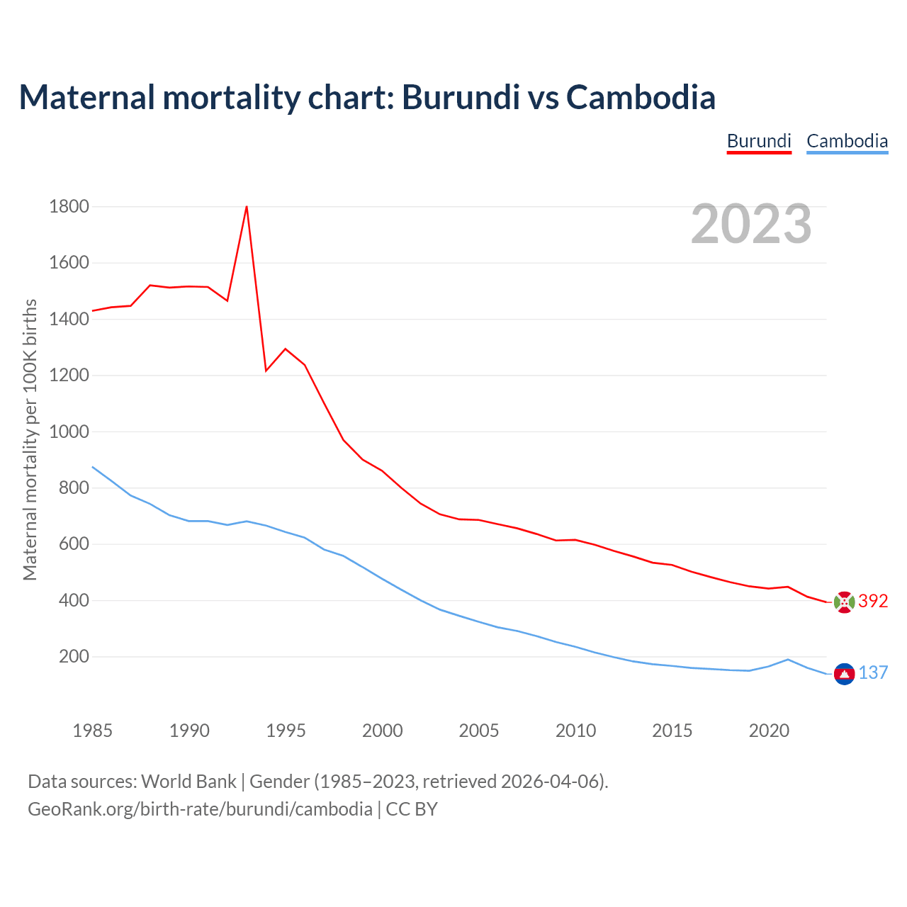 The maternal mortality rate, which is the probability of dying during childbirth or within 42 days of pregnancy termination, is 392 deaths per 100,000 live births in Burundi, compared to 137 deaths in Cambodia.