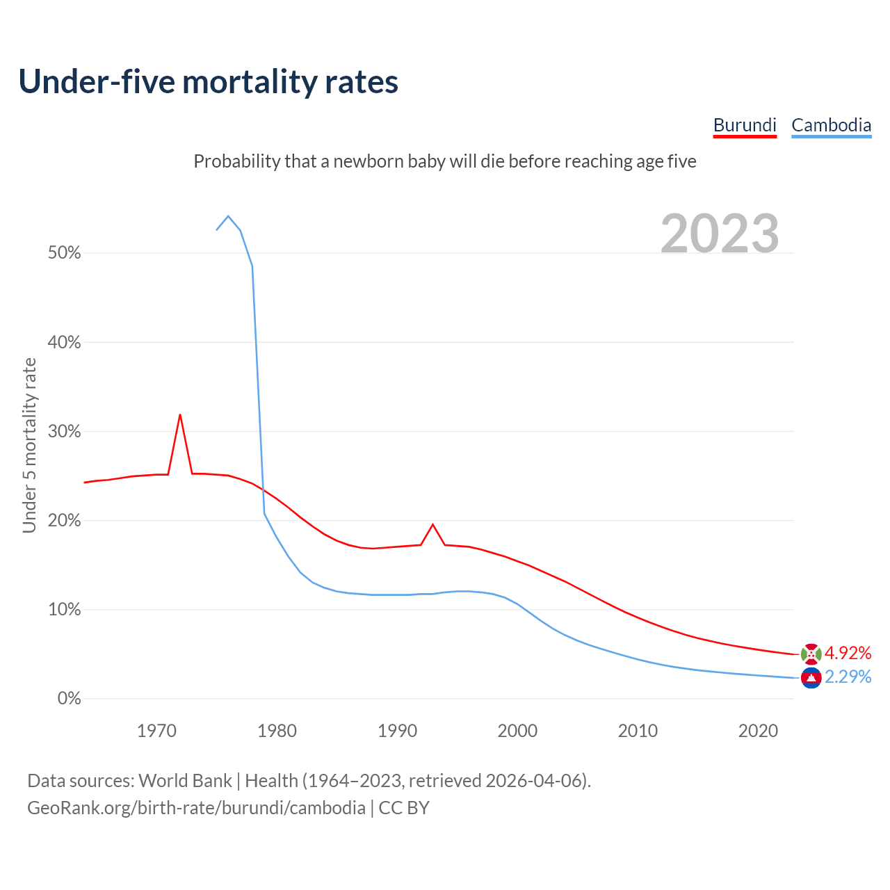 The chance that a newborn baby will die before reaching age five is 4.92% in Burundi and 2.29% in Cambodia. Above is a chart with historical data on under-five mortality rates.