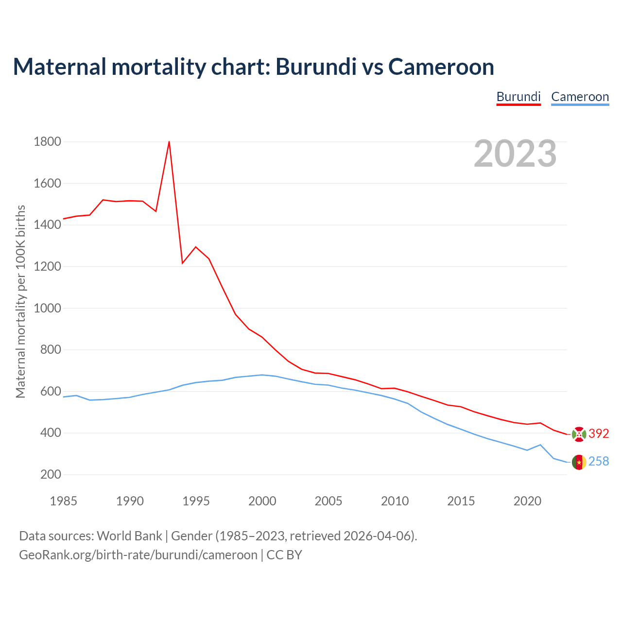 The maternal mortality rate, which is the probability of dying during childbirth or within 42 days of pregnancy termination, is 392 deaths per 100,000 live births in Burundi, compared to 258 deaths in Cameroon.