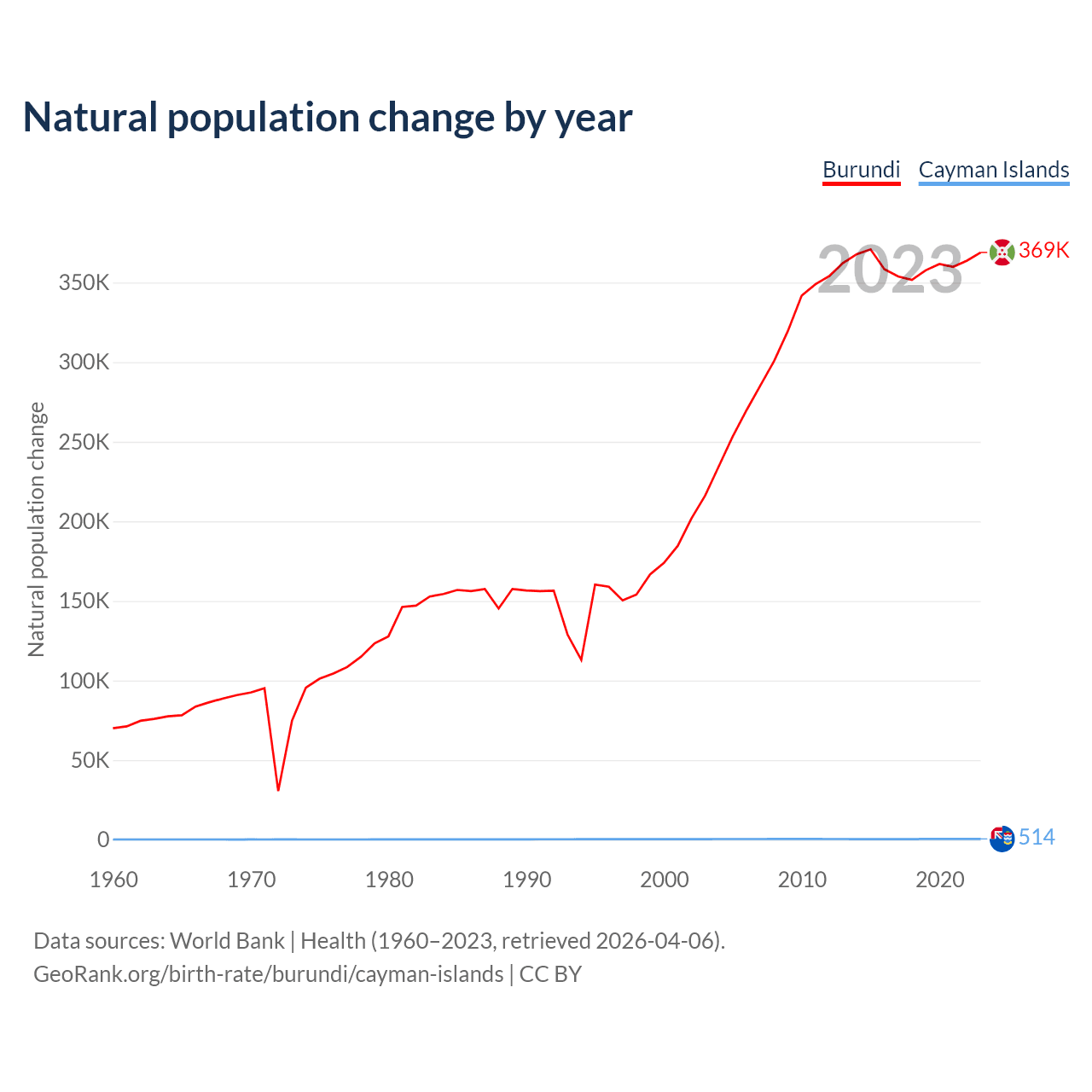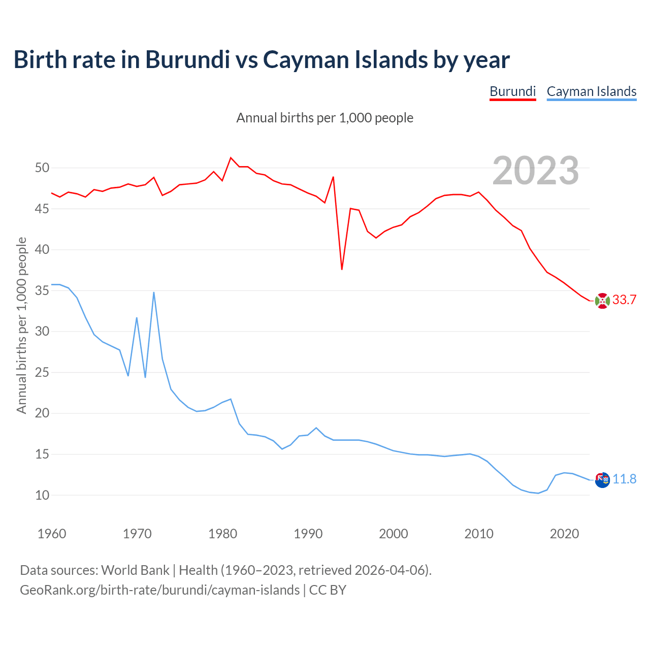 Burundi has an annual birth rate of 33.7 births per 1,000 people, compared to 11.8 for the Cayman Islands. The average number of children a woman is expected to have during her lifetime — the fertility rate, is 4.88 in Burundi and 1.53 in the Cayman Islands — 68.6% difference.