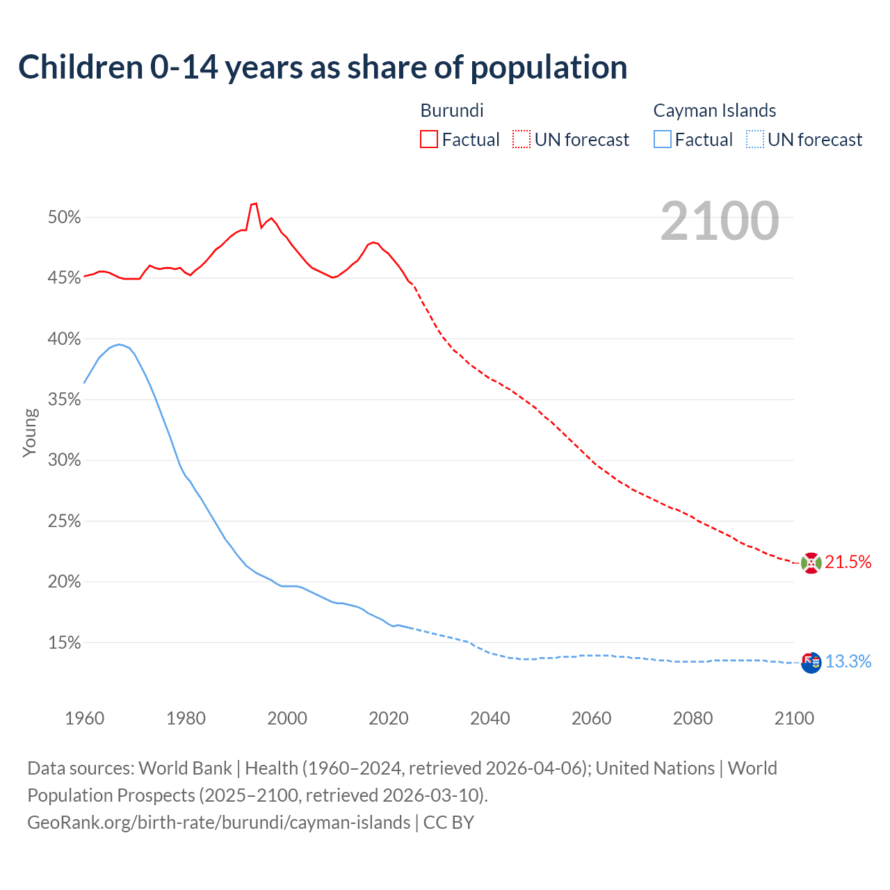 Children aged 0-14 make up 44.7% of the population in Burundi and 16.2% in the Cayman Islands in 2024, compared to 48.7% and 22.3% respectively in 1990.