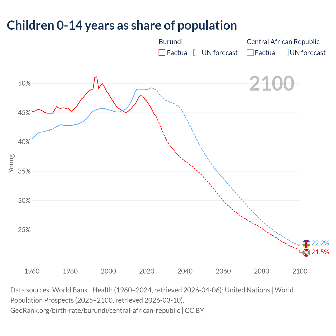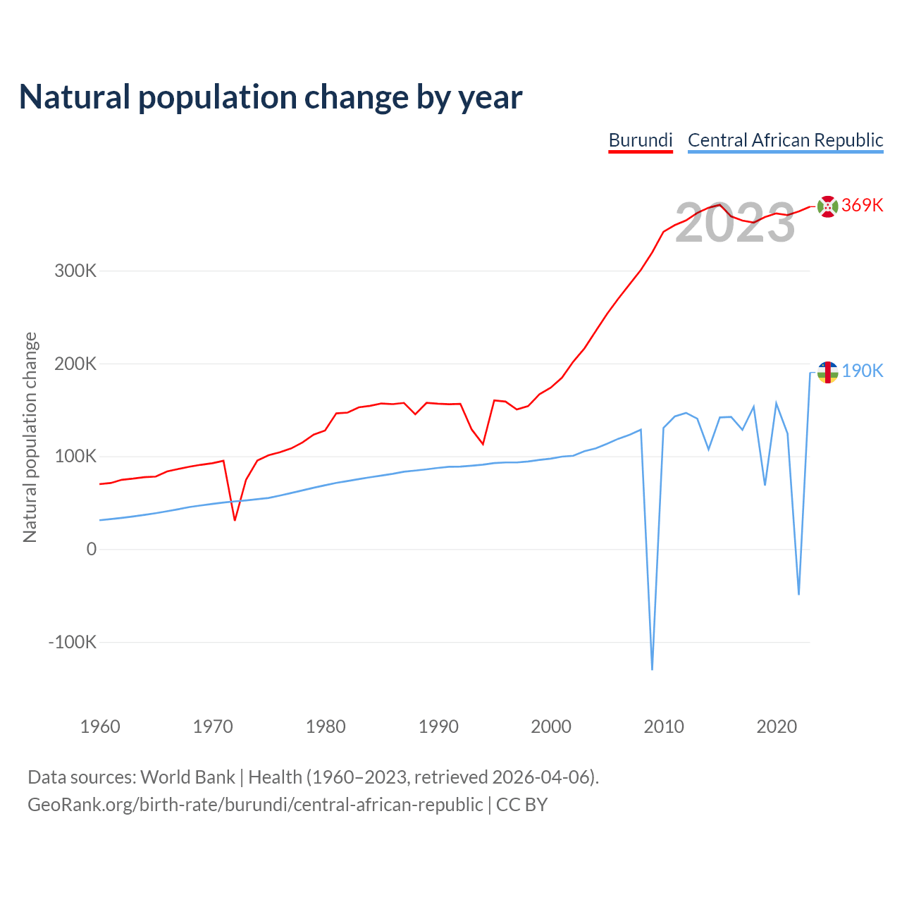Burundi has an annual birth rate of 33.7 births per 1,000 people, compared to 46.4 for the Central African Republic. The average number of children a woman is expected to have during her lifetime — the fertility rate, is 4.88 in Burundi and 6.01 in the Central African Republic — 23.2% difference.