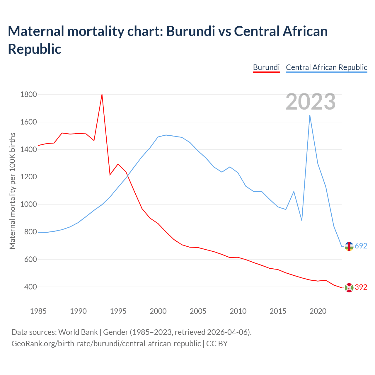 The maternal mortality rate, which is the probability of dying during childbirth or within 42 days of pregnancy termination, is 392 deaths per 100,000 live births in Burundi, compared to 692 deaths in the Central African Republic.