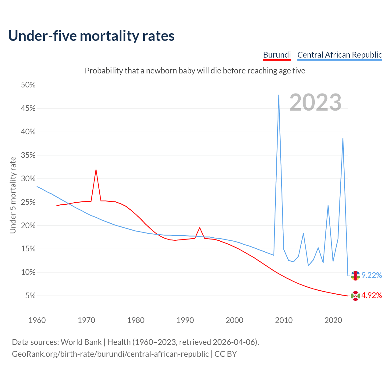 The chance that a newborn baby will die before reaching age five is 4.92% in Burundi and 9.22% in the Central African Republic. Above is a chart with historical data on under-five mortality rates.
