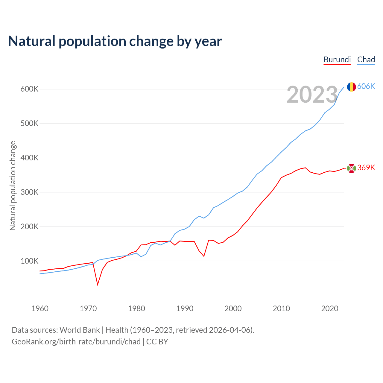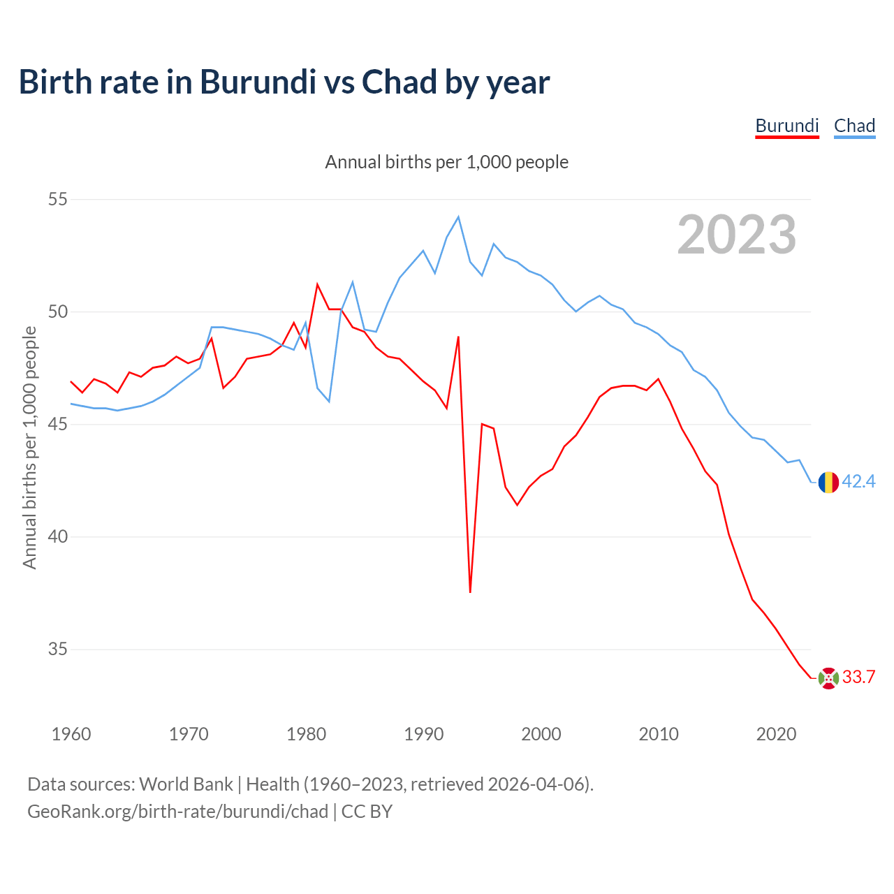 Burundi has an annual birth rate of 33.7 births per 1,000 people, compared to 42.4 for Chad. The average number of children a woman is expected to have during her lifetime — the fertility rate, is 4.88 in Burundi and 6.12 in Chad — 25.5% difference.