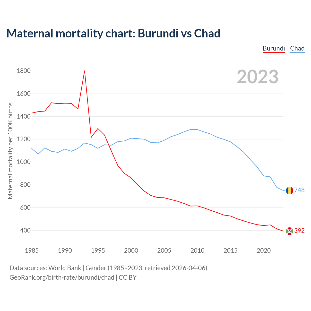 The maternal mortality rate, which is the probability of dying during childbirth or within 42 days of pregnancy termination, is 392 deaths per 100,000 live births in Burundi, compared to 748 deaths in Chad.