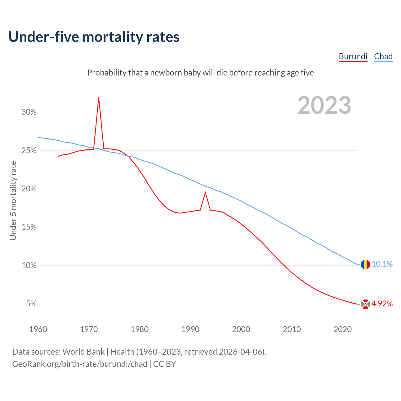 The chance that a newborn baby will die before reaching age five is 4.92% in Burundi and 10.1% in Chad. Above is a chart with historical data on under-five mortality rates.