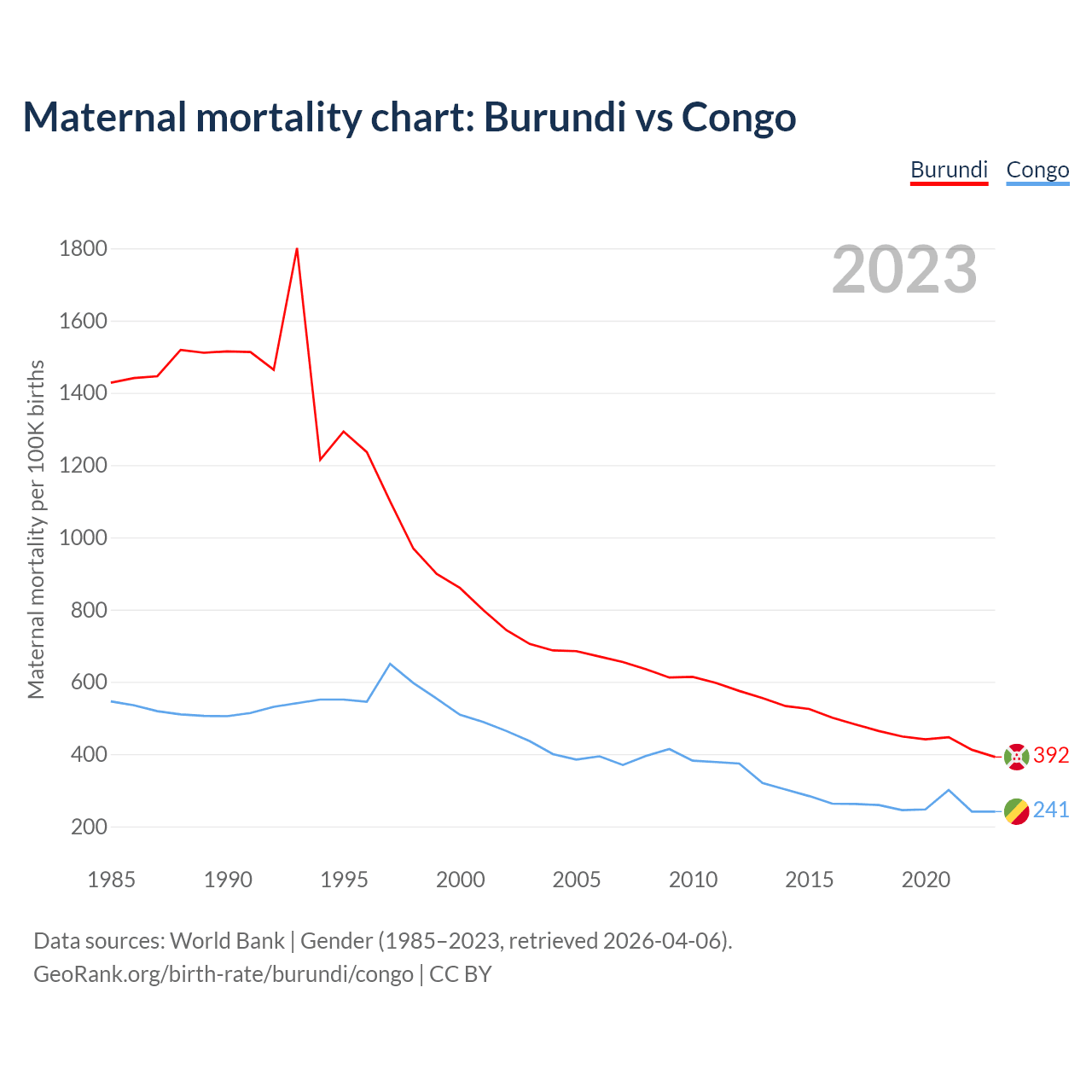The maternal mortality rate, which is the probability of dying during childbirth or within 42 days of pregnancy termination, is 392 deaths per 100,000 live births in Burundi, compared to 241 deaths in the Congo.