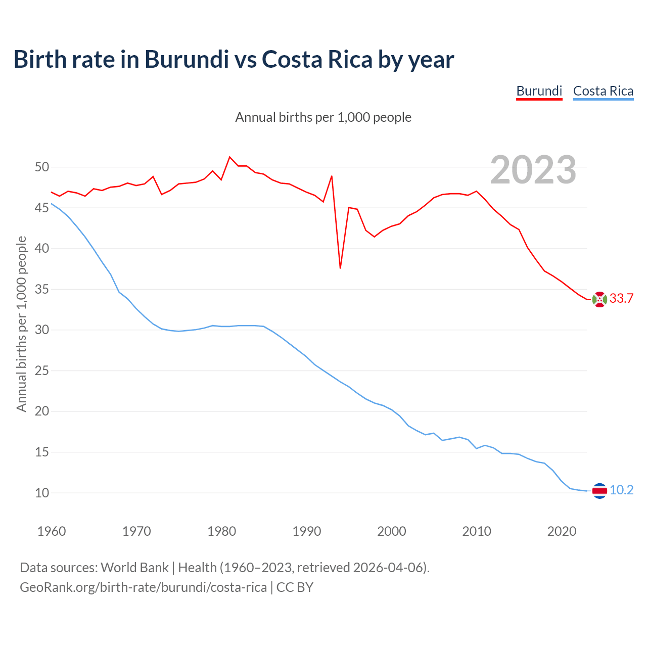 Burundi has an annual birth rate of 33.7 births per 1,000 people, compared to 10.2 for Costa Rica. The average number of children a woman is expected to have during her lifetime — the fertility rate, is 4.88 in Burundi and 1.33 in Costa Rica — 72.7% difference.