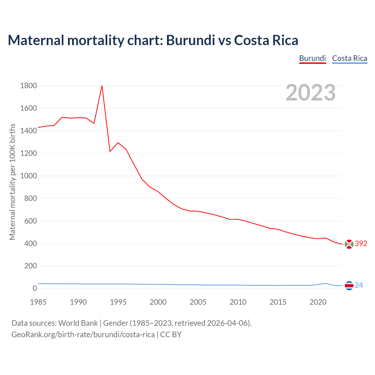 The maternal mortality rate, which is the probability of dying during childbirth or within 42 days of pregnancy termination, is 392 deaths per 100,000 live births in Burundi, compared to 24 deaths in Costa Rica.