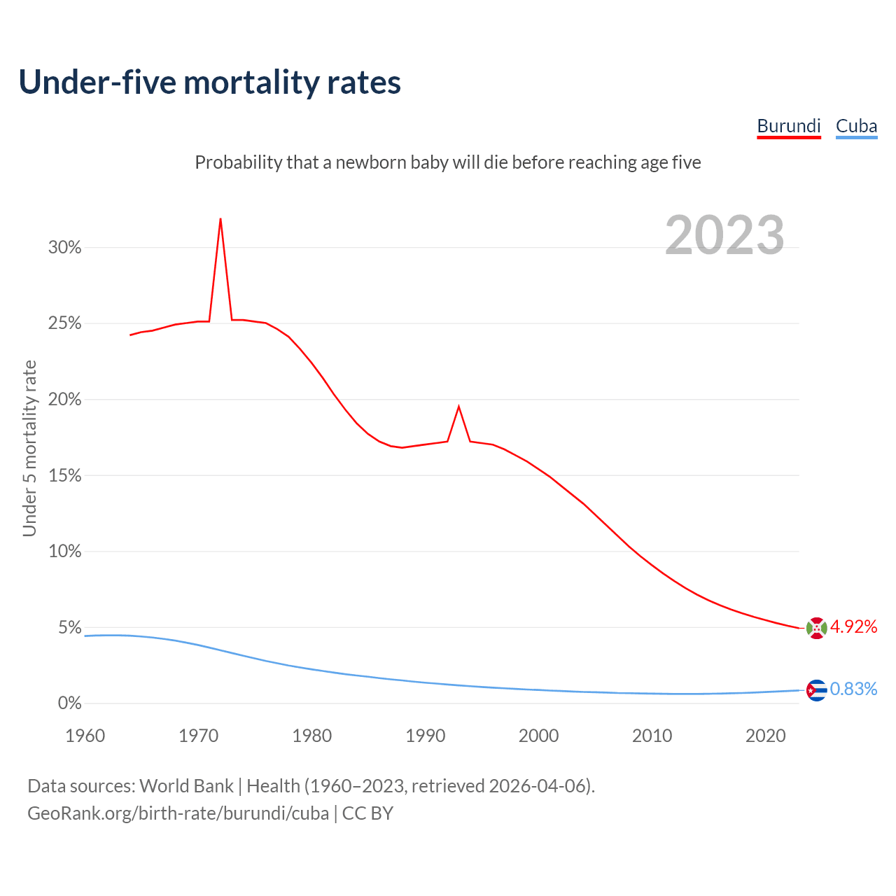The chance that a newborn baby will die before reaching age five is 4.92% in Burundi and 0.83% in Cuba. Above is a chart with historical data on under-five mortality rates.
