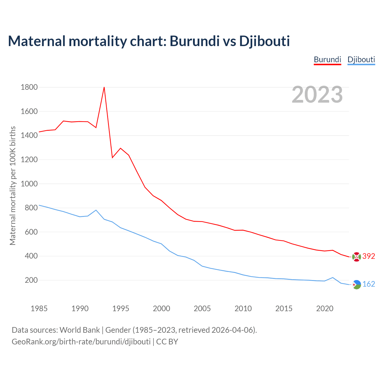 The maternal mortality rate, which is the probability of dying during childbirth or within 42 days of pregnancy termination, is 392 deaths per 100,000 live births in Burundi, compared to 162 deaths in Djibouti.