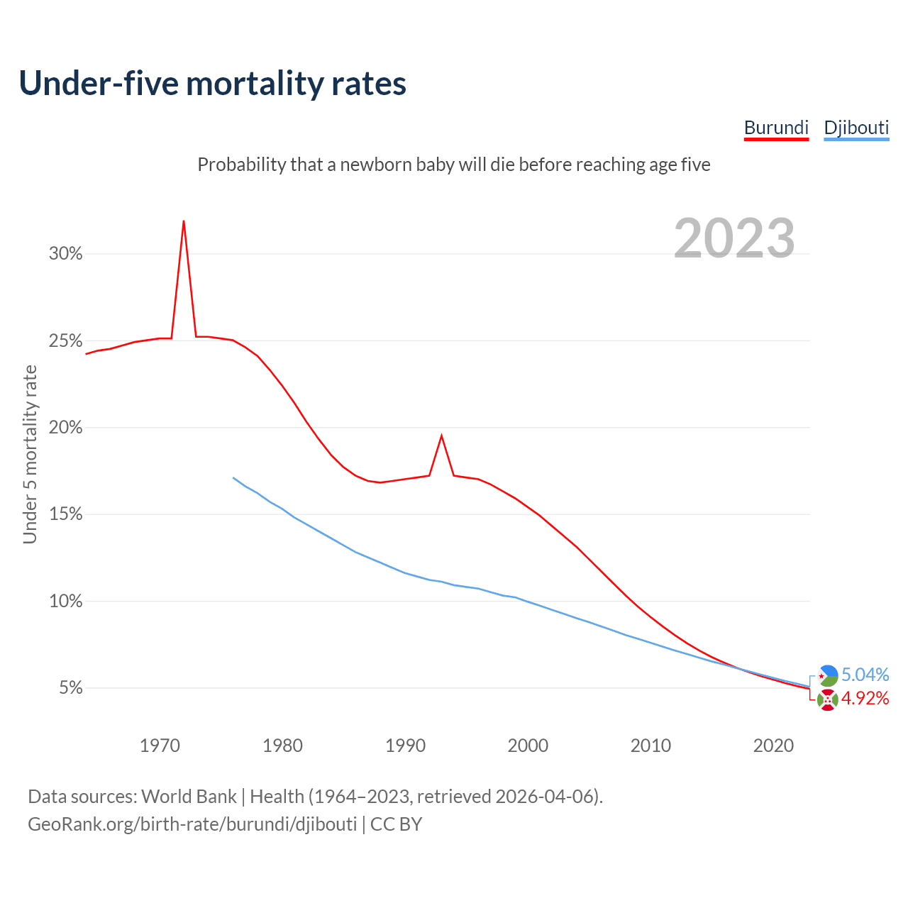 The chance that a newborn baby will die before reaching age five is 4.92% in Burundi and 5.04% in Djibouti. Above is a chart with historical data on under-five mortality rates.
