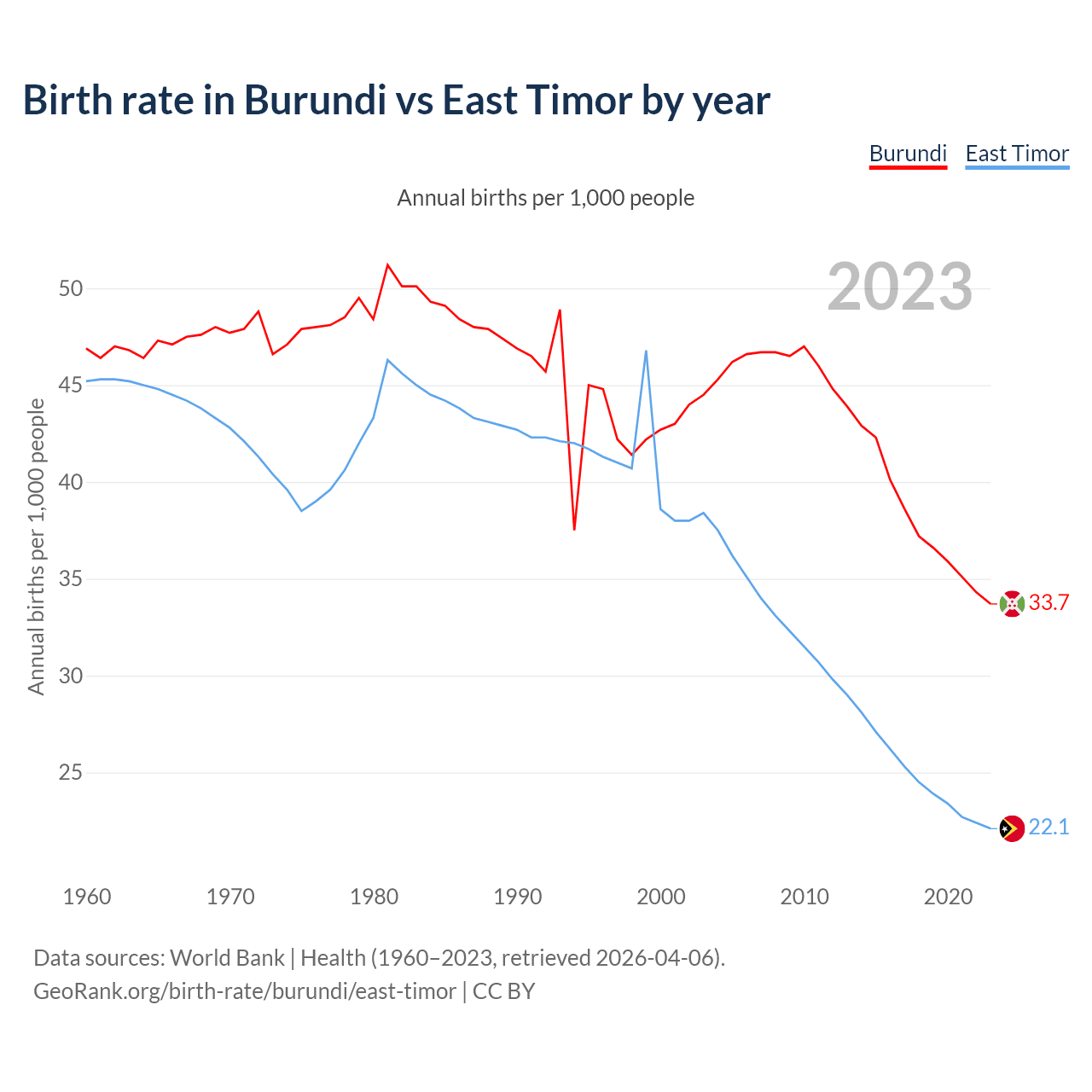 Burundi has an annual birth rate of 33.7 births per 1,000 people, compared to 22.1 for East Timor. The average number of children a woman is expected to have during her lifetime — the fertility rate, is 4.88 in Burundi and 2.71 in East Timor — 44.5% difference.