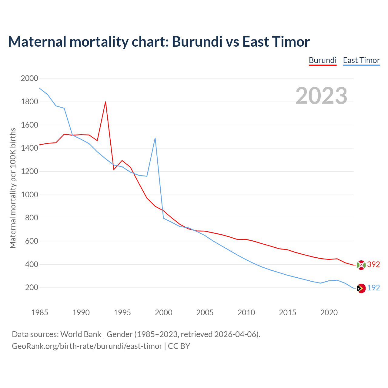 The maternal mortality rate, which is the probability of dying during childbirth or within 42 days of pregnancy termination, is 392 deaths per 100,000 live births in Burundi, compared to 192 deaths in East Timor.