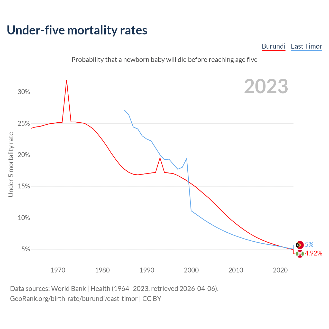 The chance that a newborn baby will die before reaching age five is 4.92% in Burundi and 5% in East Timor. Above is a chart with historical data on under-five mortality rates.