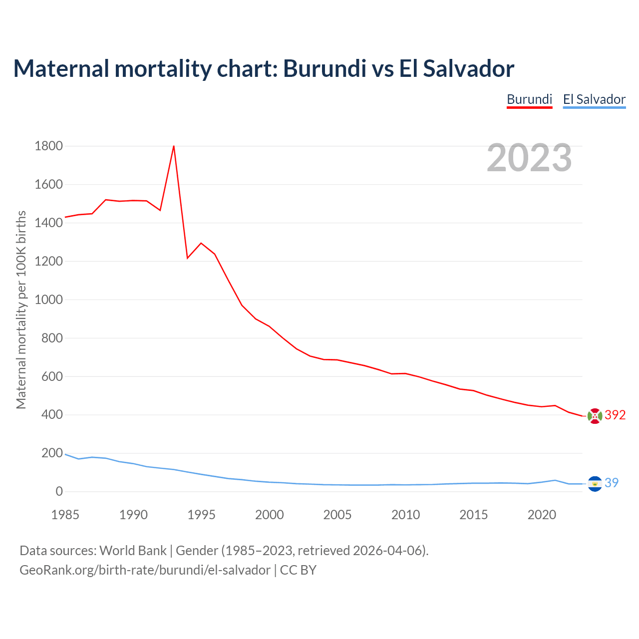 The maternal mortality rate, which is the probability of dying during childbirth or within 42 days of pregnancy termination, is 392 deaths per 100,000 live births in Burundi, compared to 39 deaths in El Salvador.