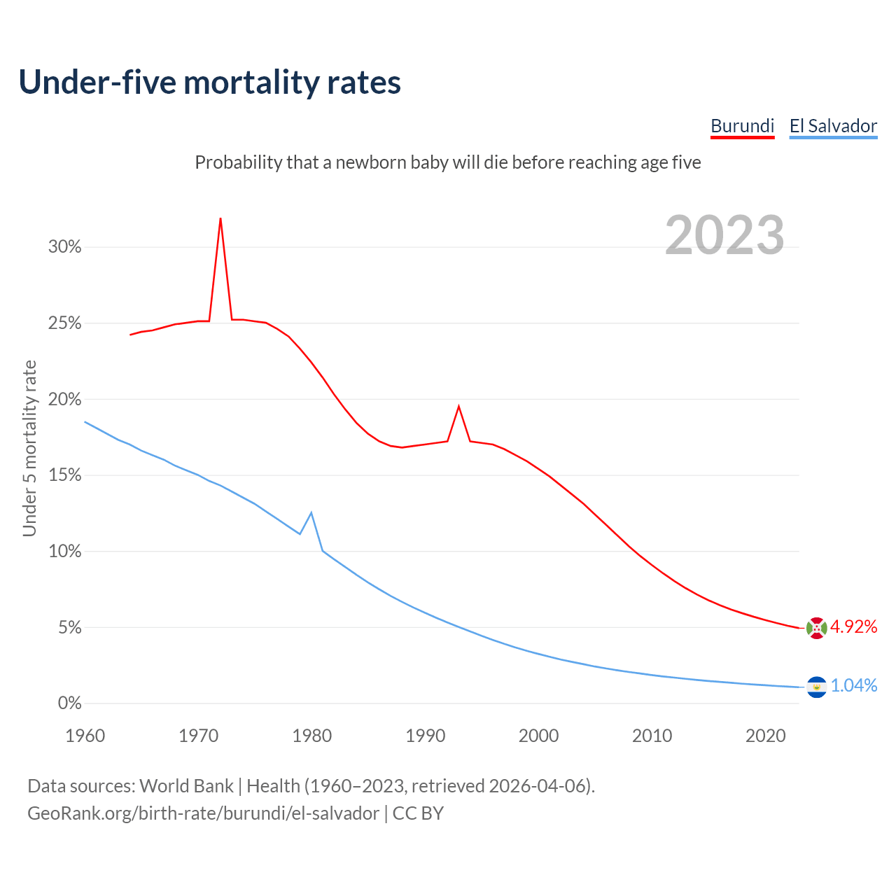 The chance that a newborn baby will die before reaching age five is 4.92% in Burundi and 1.04% in El Salvador. Above is a chart with historical data on under-five mortality rates.