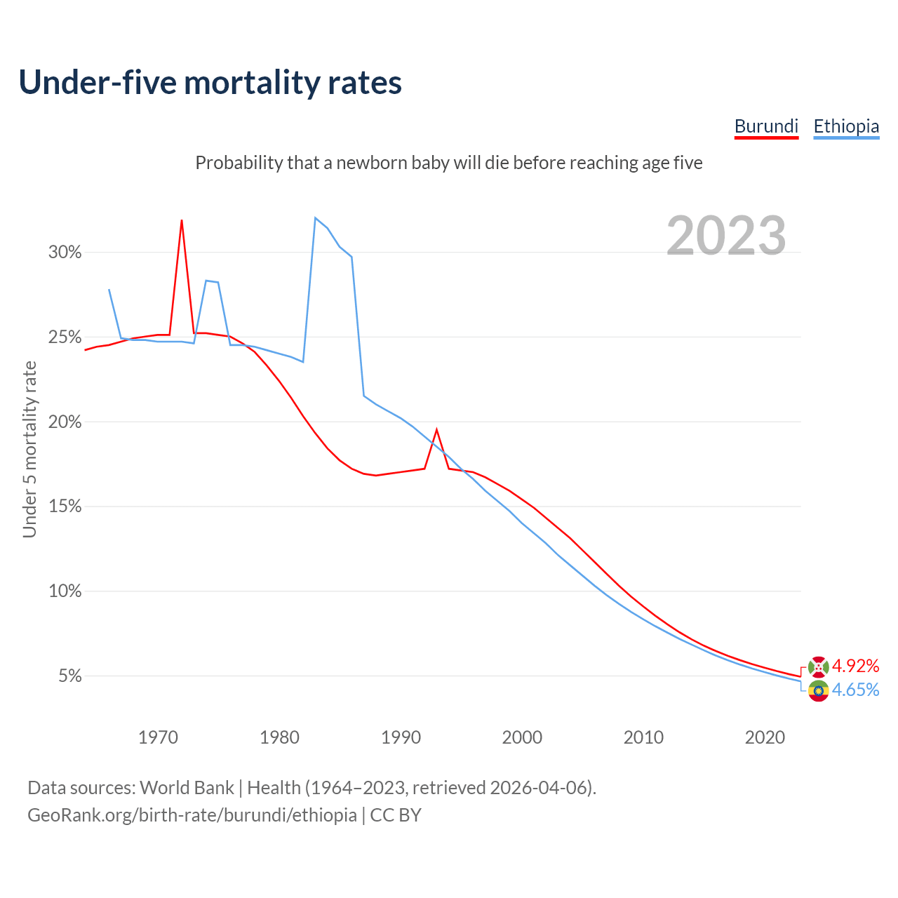 The chance that a newborn baby will die before reaching age five is 4.92% in Burundi and 4.65% in Ethiopia. Above is a chart with historical data on under-five mortality rates.