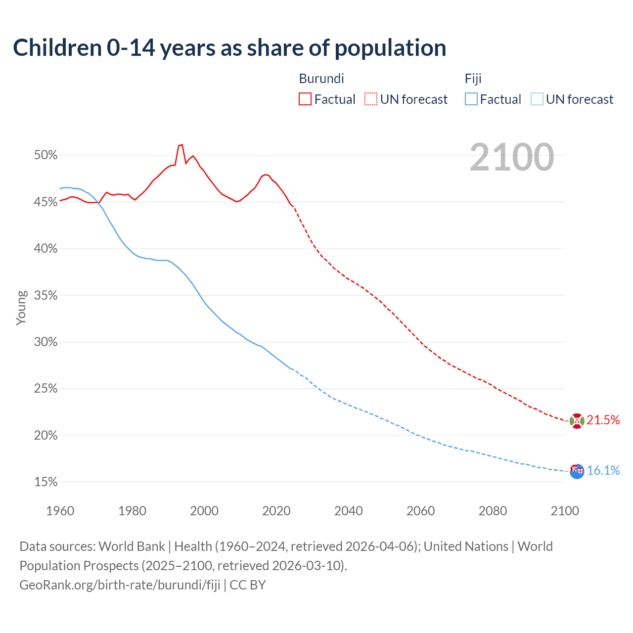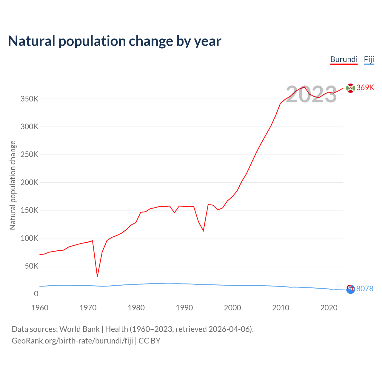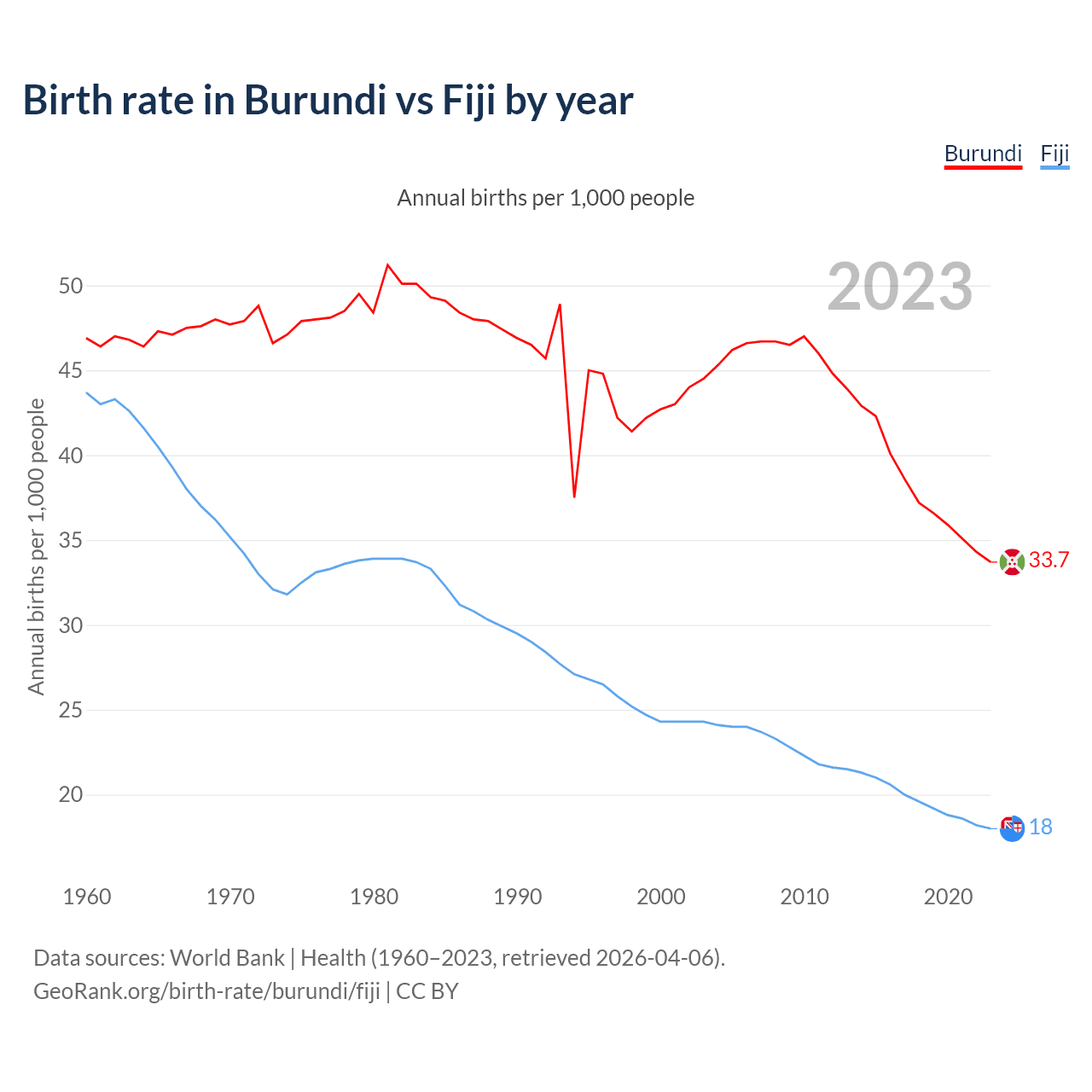 Burundi has an annual birth rate of 33.7 births per 1,000 people, compared to 18 for Fiji. The average number of children a woman is expected to have during her lifetime — the fertility rate, is 4.88 in Burundi and 2.28 in Fiji — 53.2% difference.