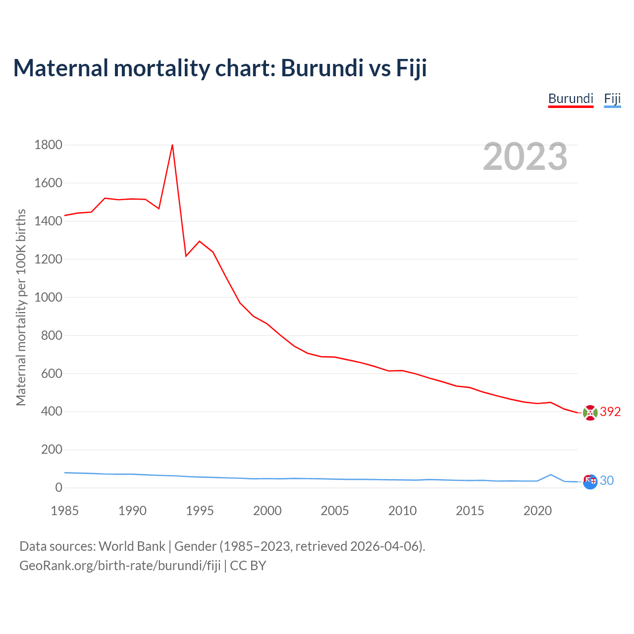 The maternal mortality rate, which is the probability of dying during childbirth or within 42 days of pregnancy termination, is 392 deaths per 100,000 live births in Burundi, compared to 30 deaths in Fiji.