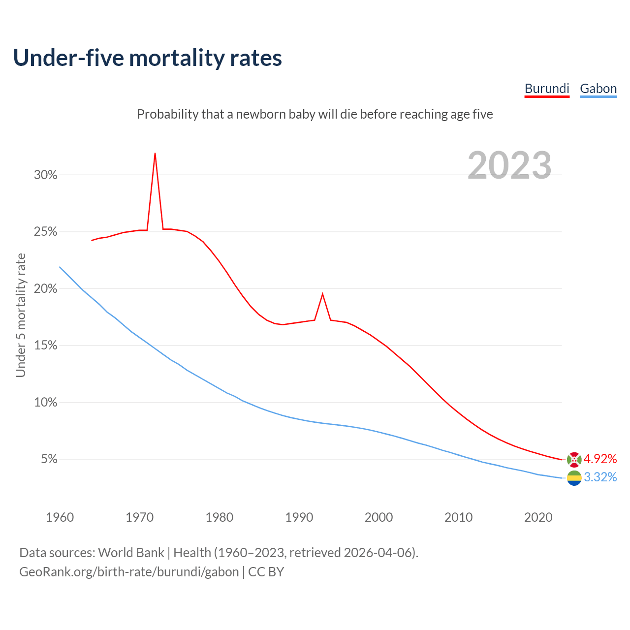 The chance that a newborn baby will die before reaching age five is 4.92% in Burundi and 3.32% in Gabon. Above is a chart with historical data on under-five mortality rates.