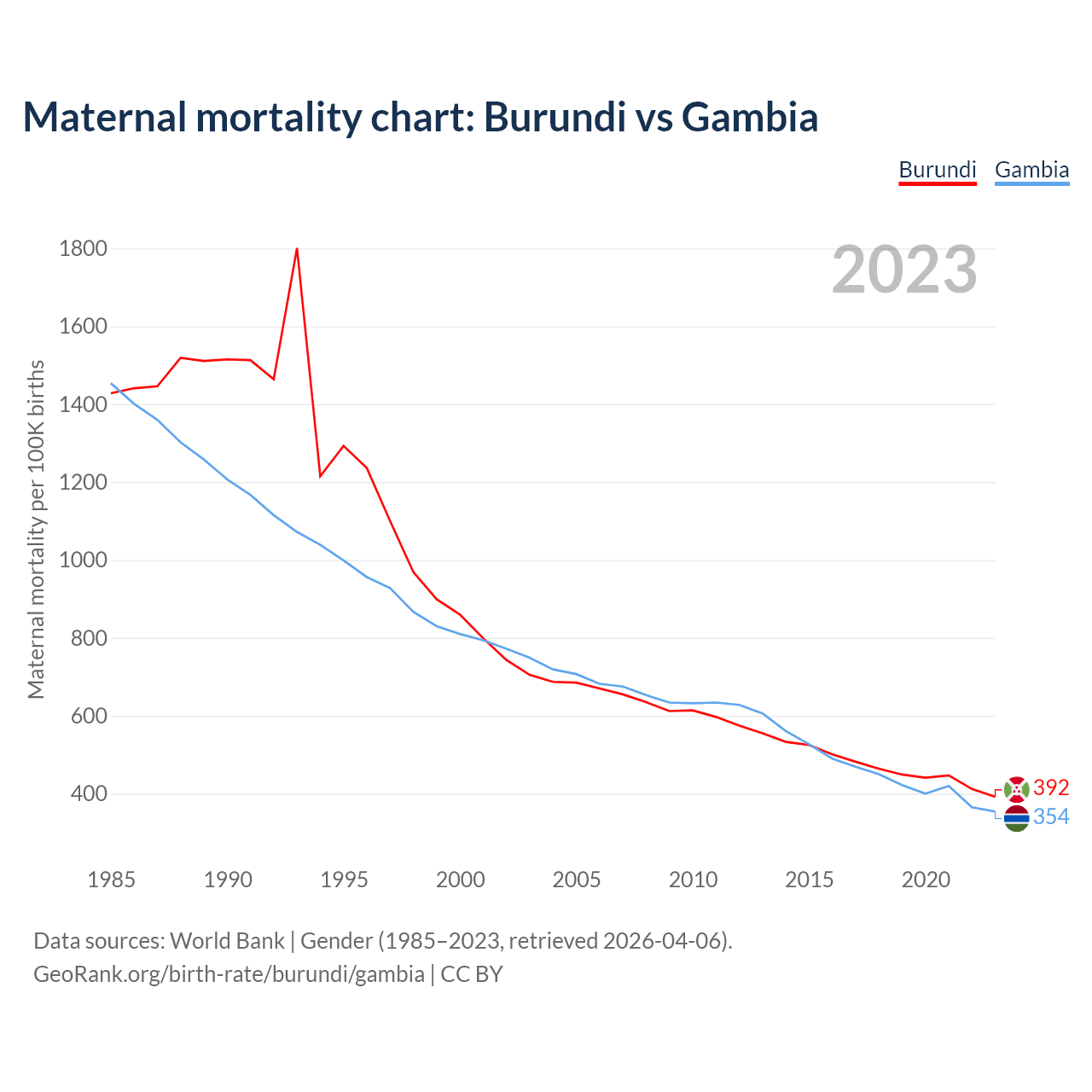 The maternal mortality rate, which is the probability of dying during childbirth or within 42 days of pregnancy termination, is 392 deaths per 100,000 live births in Burundi, compared to 354 deaths in the Gambia.