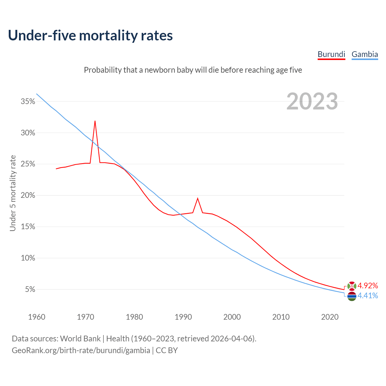 The chance that a newborn baby will die before reaching age five is 4.92% in Burundi and 4.41% in the Gambia. Above is a chart with historical data on under-five mortality rates.
