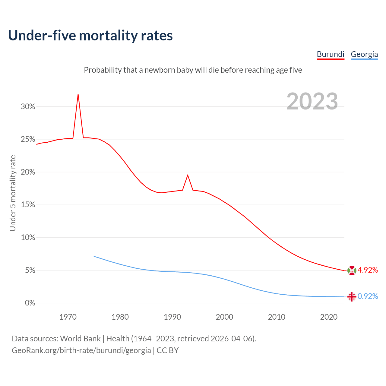 The chance that a newborn baby will die before reaching age five is 4.92% in Burundi and 0.92% in Georgia. Above is a chart with historical data on under-five mortality rates.