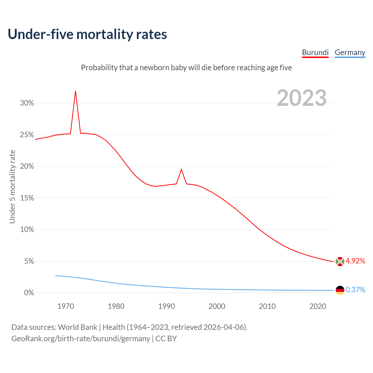The chance that a newborn baby will die before reaching age five is 4.92% in Burundi and 0.37% in Germany. Above is a chart with historical data on under-five mortality rates.