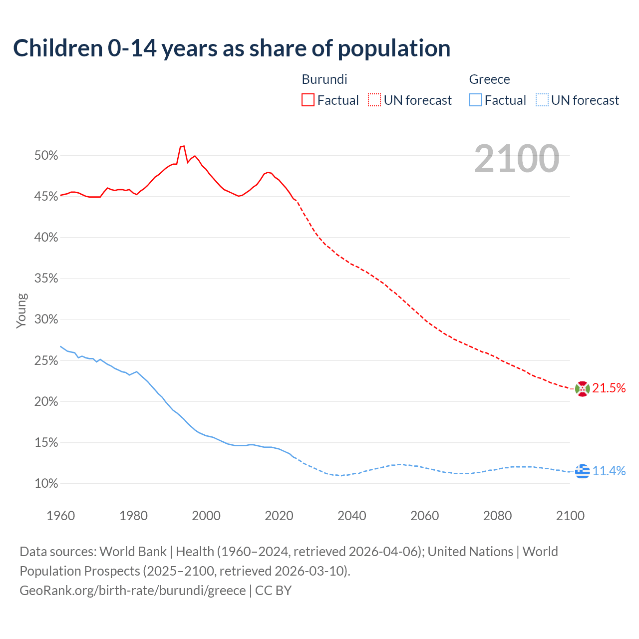 According to the latest available data on birth rates, the fertility rate in Burundi was 4.88 children per woman in 2023, compared to 1.32 in Greece in 2023. The replacement level is considered to be 2.1 children per woman.
